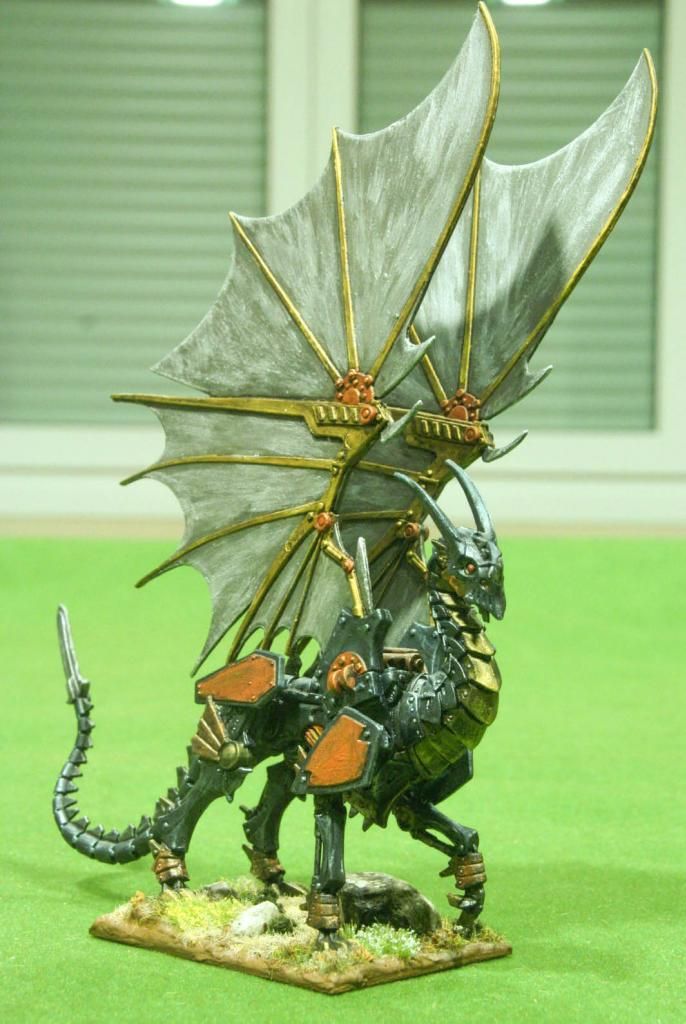 En este caso se trata de la banda de IHMN que me he montado. La pieza central es el dragón mecánico de Reaper, que he pensado usarla como una mezcla del caballo a vapor Cody, con garras a vapor, lanzallamas y ornitocóptero (eso son 60 puntarracos de base más la armadura que quiera meterle y otros bonos/talentos)