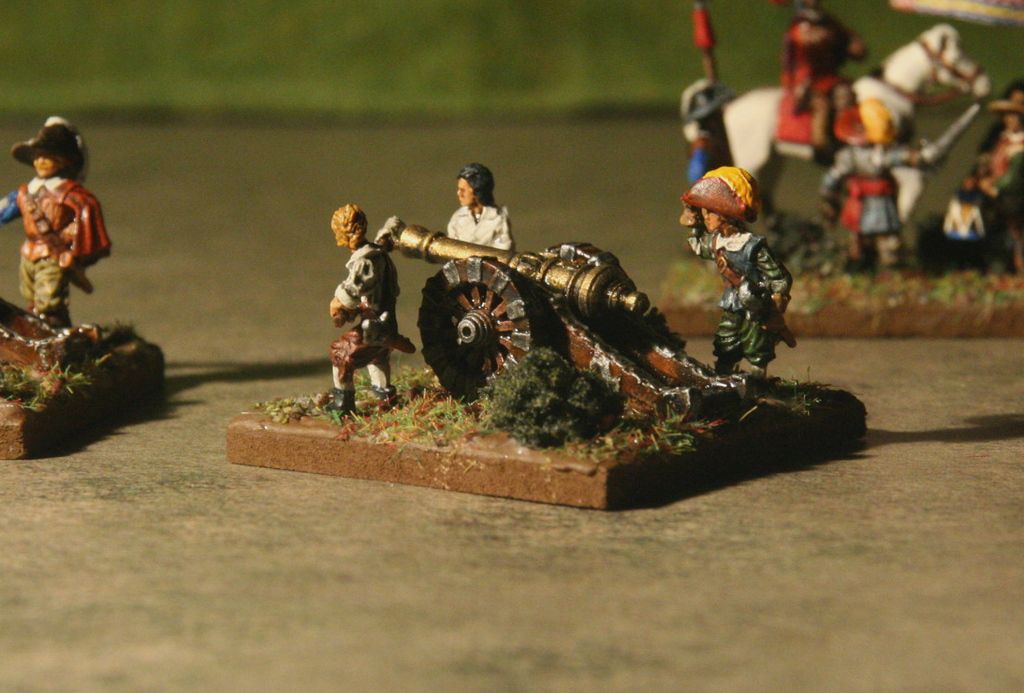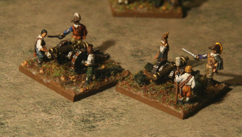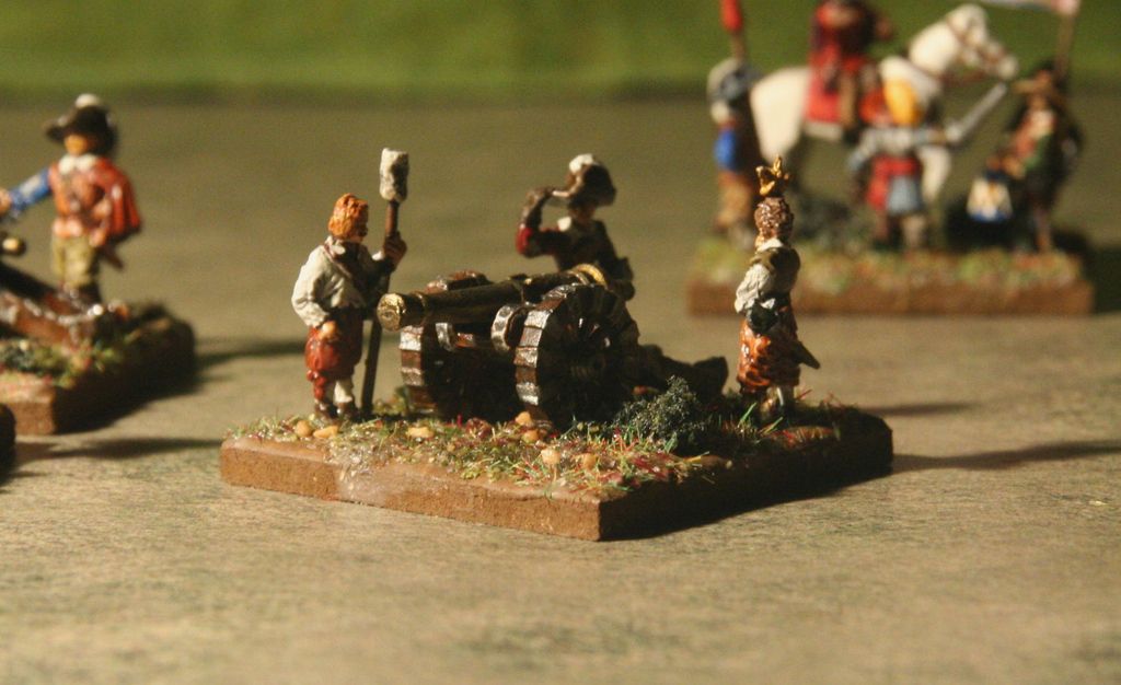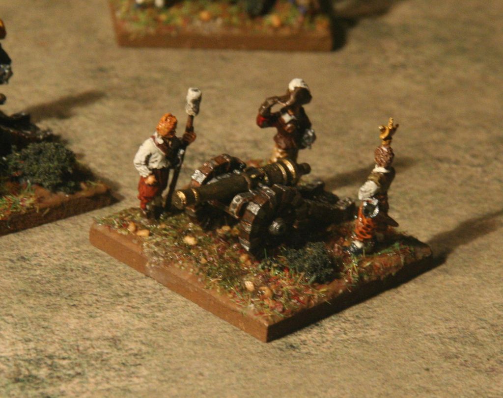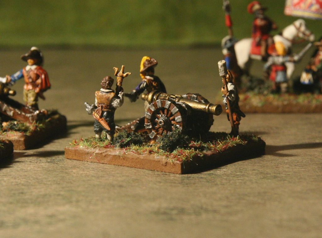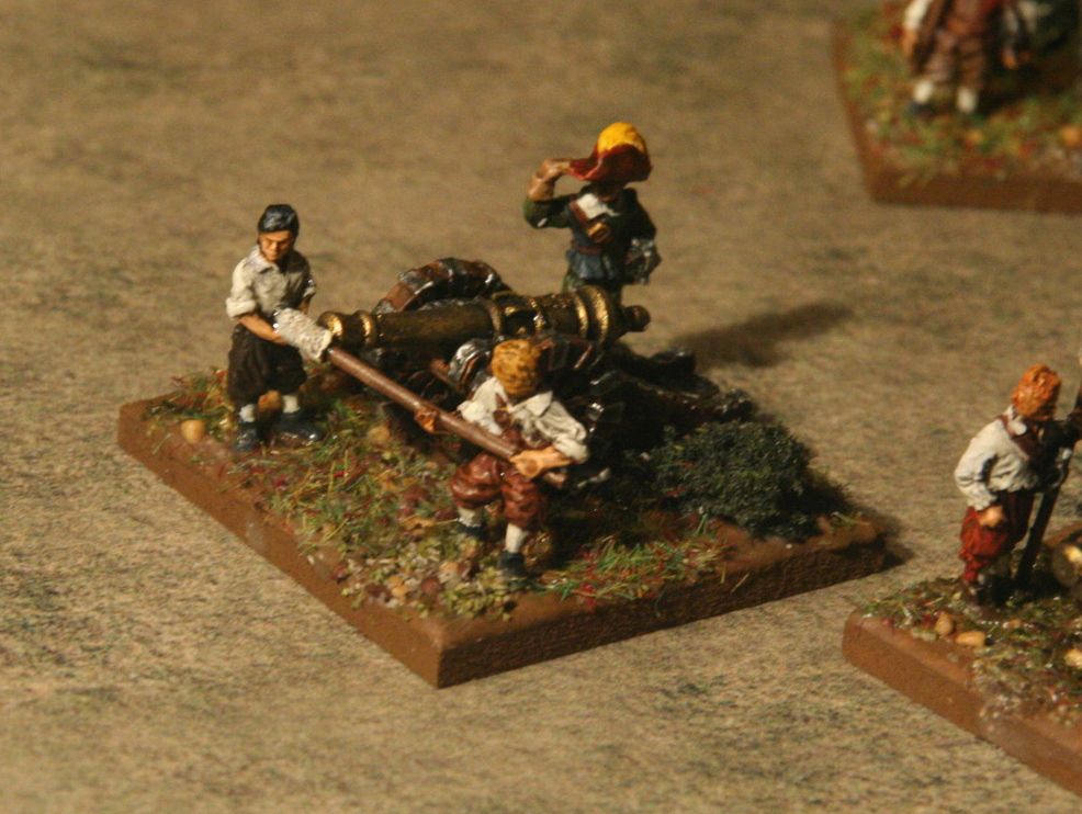 En FoG-R, el Late Imperial Spanish lleva entre 2 y 4 piezas de artillería medias y dos pesadas. Estos últimos días me he pintado los 4 cañones medios y los artilleros de los pesados a la espera que Totentanz saque la artillería pesada. Os dejo aquí los resultados. La bolsa de artilleros tiene 6 poses y como dos son con baqueta la manera lógica de colocarlos es de 3 en 3. Para la pesada he pintado 4 artilleros, así podré distinguirla mejor
