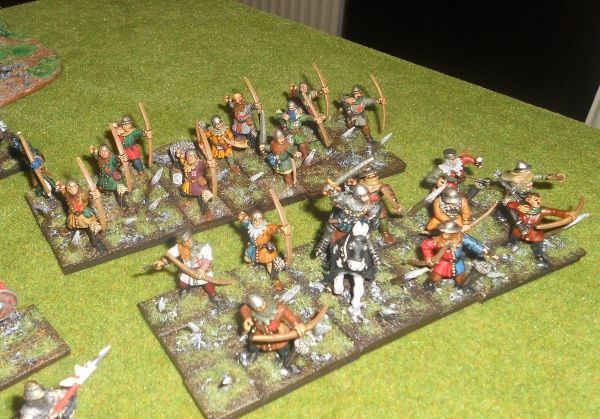 Las miniaturas están todas montadas en bases individuales y pegadas con cinta de doble cara en bases de frontal de 60 mm, por si algún día me da por usarlos para el Arte de la Guerra. Se podrían hacer dos listas de unos 300 puntos cada una.