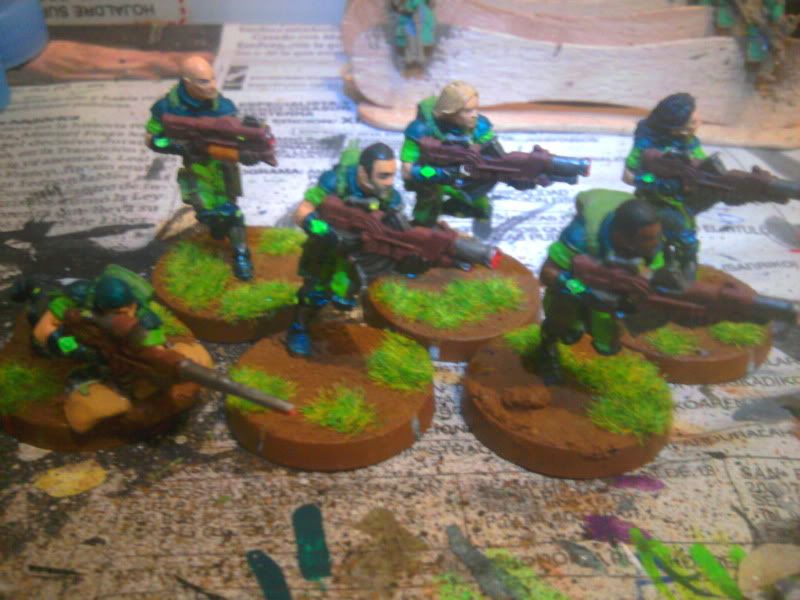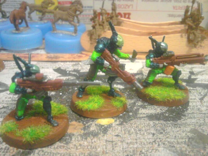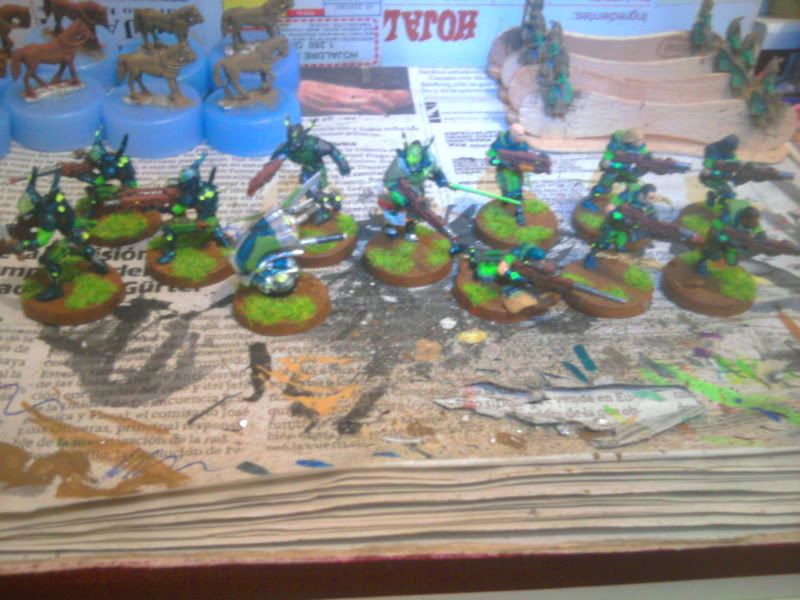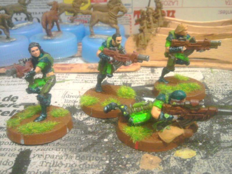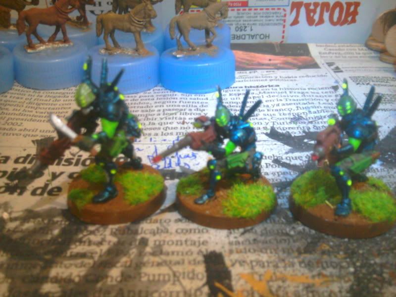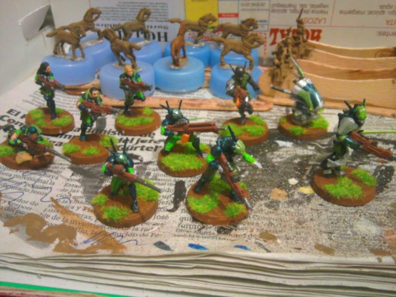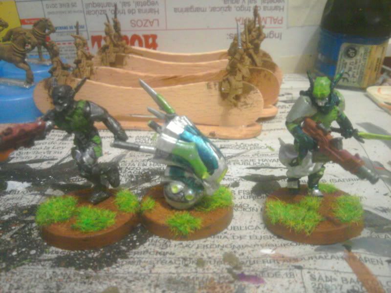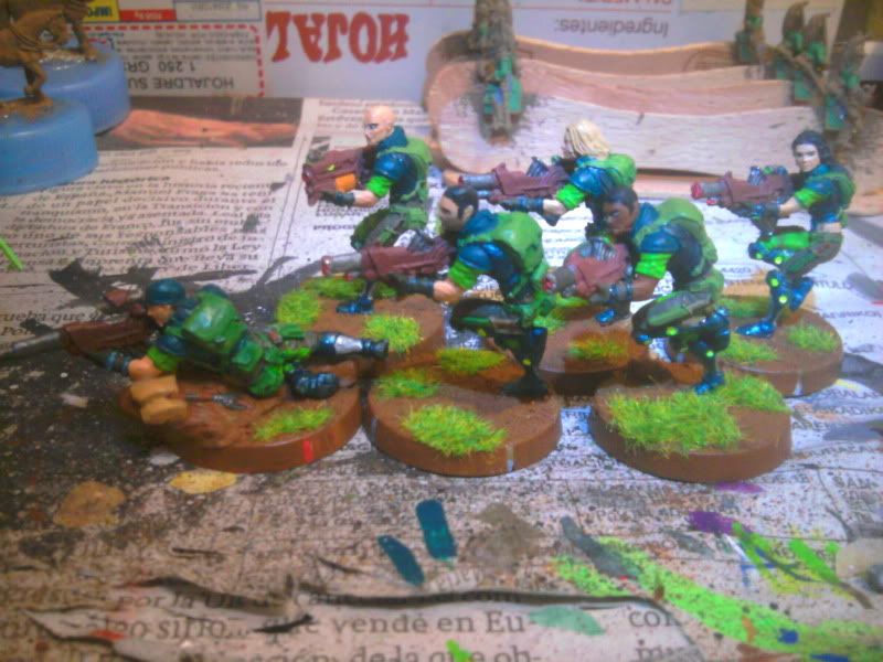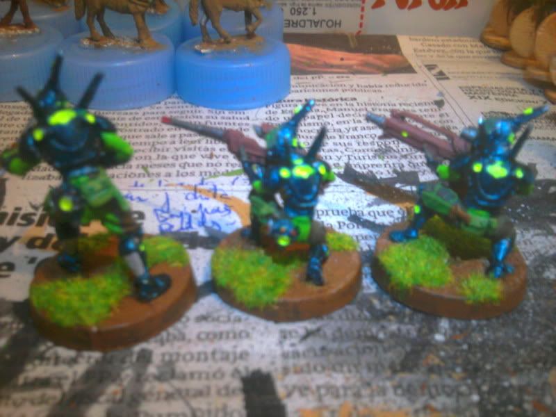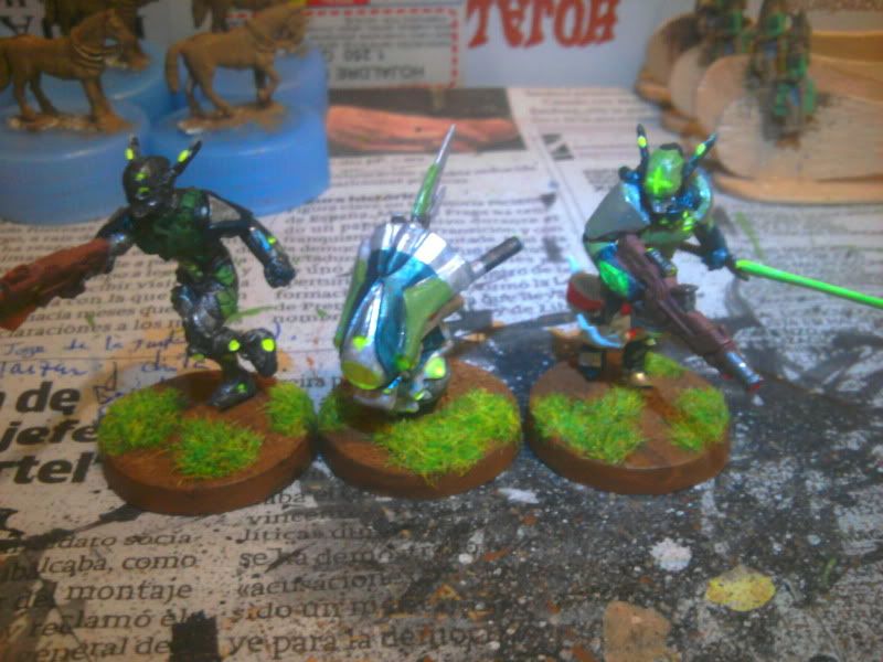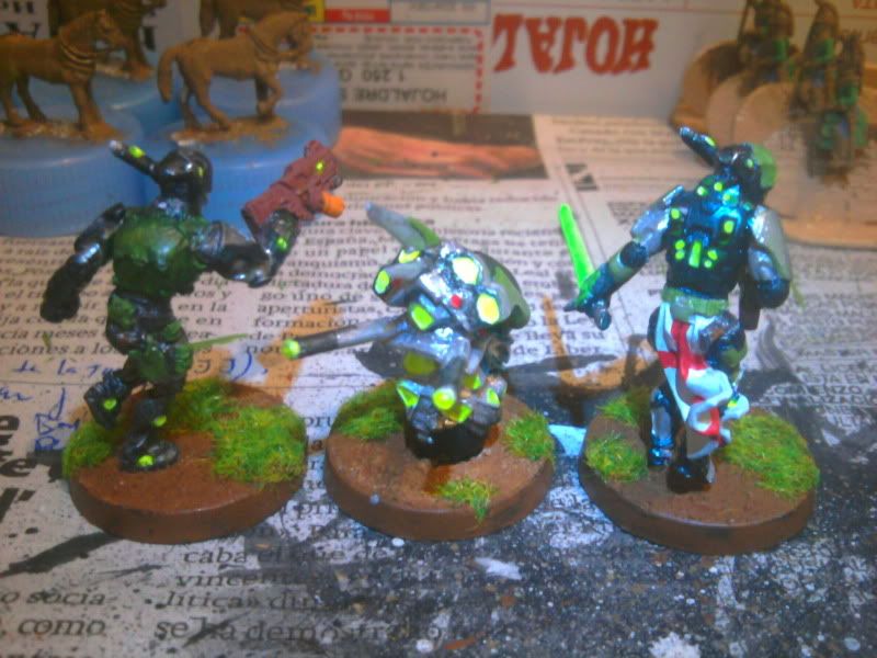 Particularmente me gustan los acabados en tonos mate y de camuflaje para Acontecimiento (así voy a pintar los míos, que se parecerán más a soldados de hoy que otra cosa) pero el toque fluorescente y moderno que le has dado me gusta para Sci Fi y me gustaría hacer algo así para mis japoneses. ¿Qué colores has usado? ¿Alguna pintura en especial para el acabado del robot en particular?