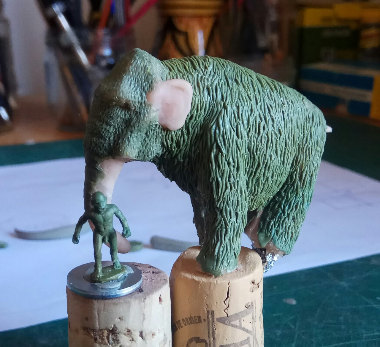Ah, sí, está a escala 15mm para que vaya bien con unos guerreros tribales que estuve esculpiendo hace un par de veranos en esa escala y también para poder jugar con megafauna en un tablero pequeño.