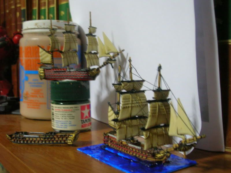 He pintado unos barcos de Langton 1/1200 e incluso enjarciado uno de ellos. La pintura, al estilo histórico quiero-jugar-rápido-no-tengo-tiempo, queda suficientemente bien. En mano bastante mejor.