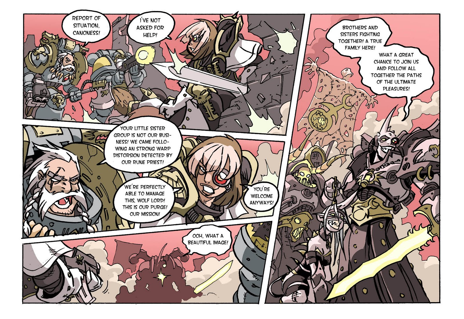 - Pros. Es un dios que MOLA, tetas y culos, despues de leer a Ian Watson y sus orgias de marines del caos con hombres cabra me quedé con las ganas de este ejercito, tetas y culos, poder modelar diablillas, aprovechar las amazonas de pendraken como diablillas,guitarras electricas,  tetas y culos, tener escusa para modelar el campeón del caos con la diablilla esclava de "sister and wolf"