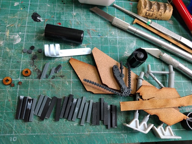 Para el brazo derecho vamos a probar a hacer una sierra mecánica escala titán. Recopilamos piezas, restos de trama de plástico, de MDF, una cadena, el tren de aterrizaje de un Ala-X: (268)