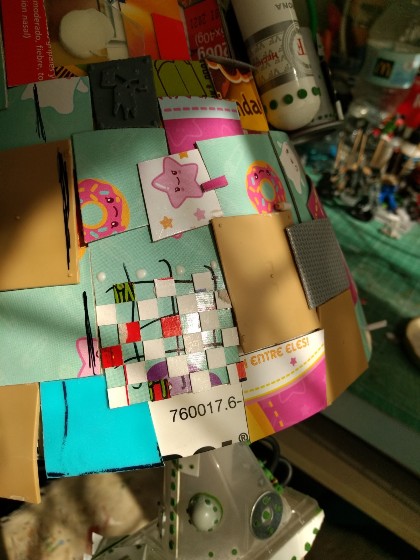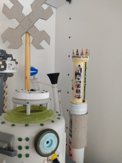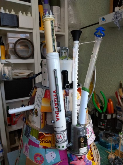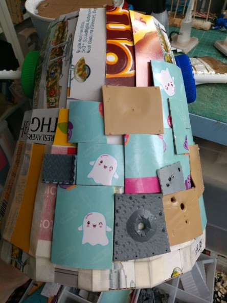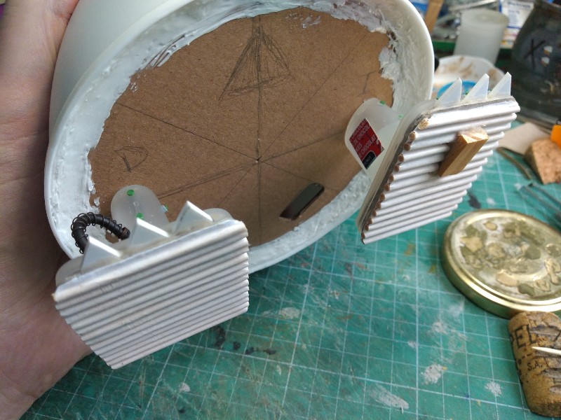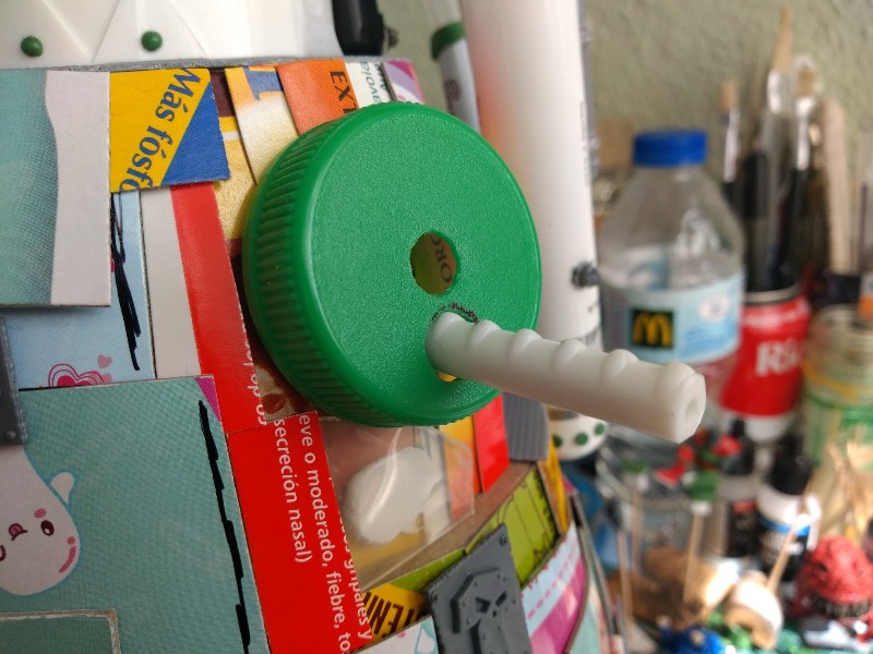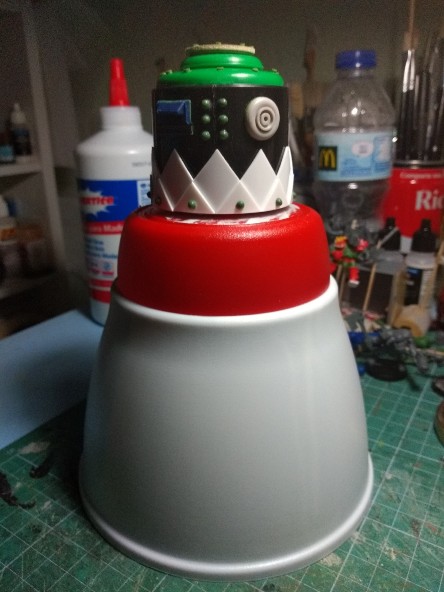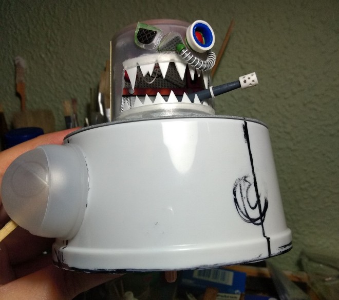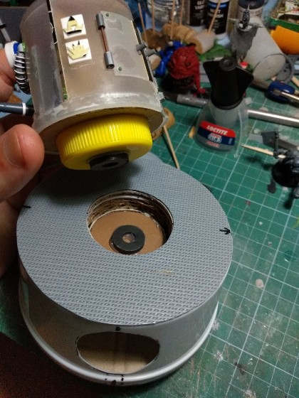 Detallamos la parte superior (que está hecha con un tupper de comida china, pollo al limón en concreto), y añadimos un par de imanes para el sistema de rotación de la cabeza: (323)