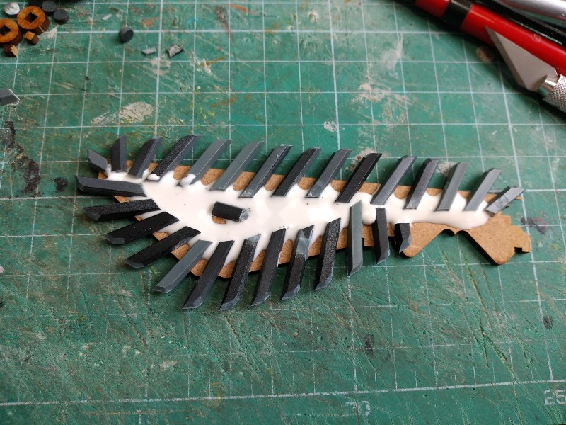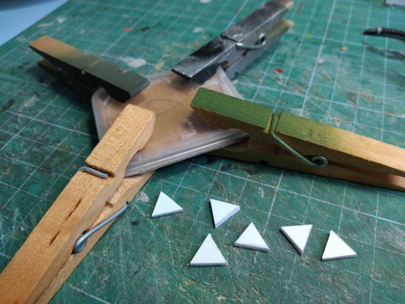 Pegamos todo bien en su sitio con cola blanca de carpintero, y aseguramos con pinzas. Mientras se seca, buscamos en la caja de recortes de plasticard y sacamos una "uñas" triangulares para decorar tan singulares zapatos orkos: (278)