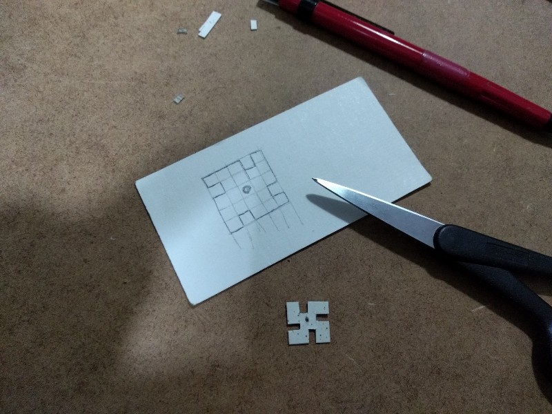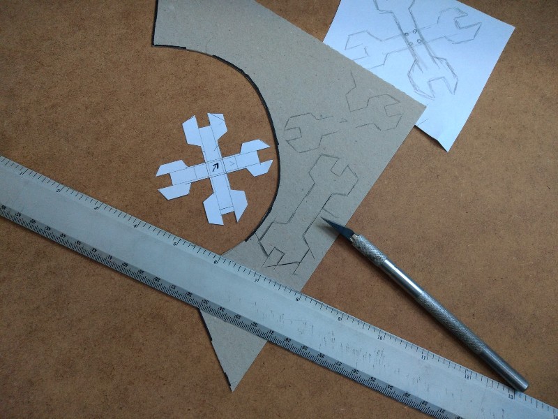 Sigo pensando en personalizar el bicho a más no poder, y hay un glifo orko que me encanta (el de "familia", "sentido de orkicidad"), pero es una especie de cruz gamada rara. Hacemos un par de pruebas hasta que damos con la proporción correcta (es en base a 5). La cortamos en cartón fino y la añadiremos al delantal-blindado: (313)