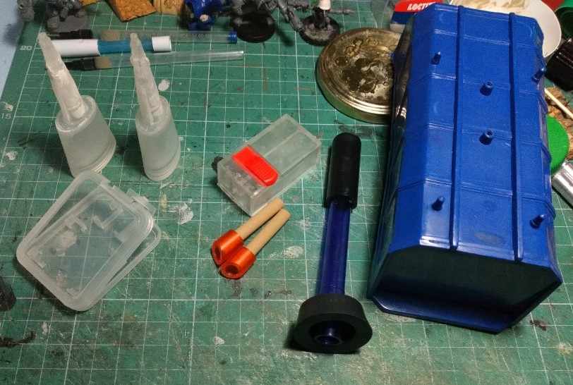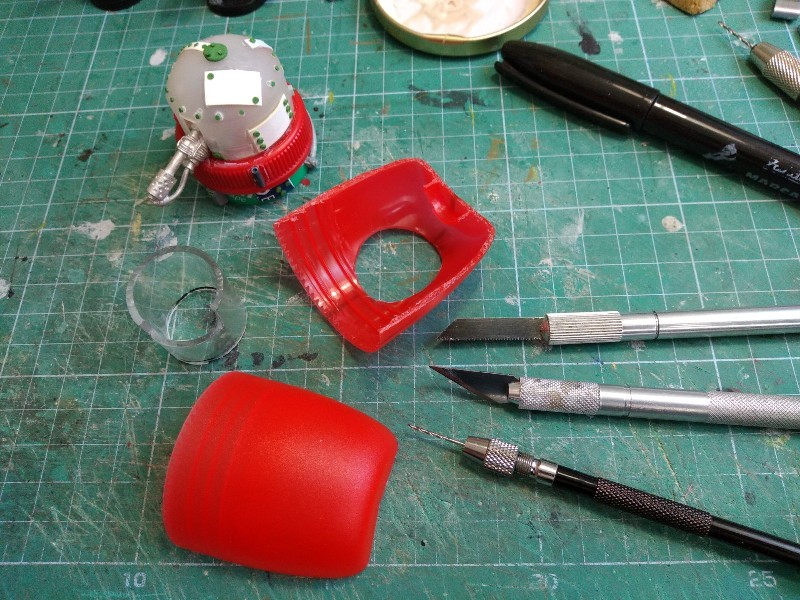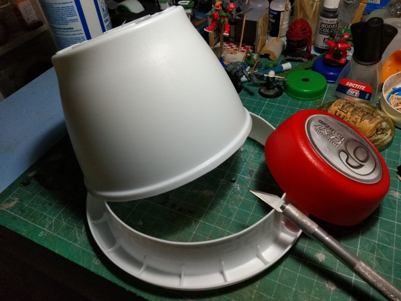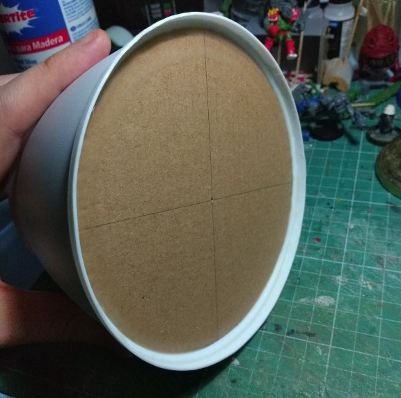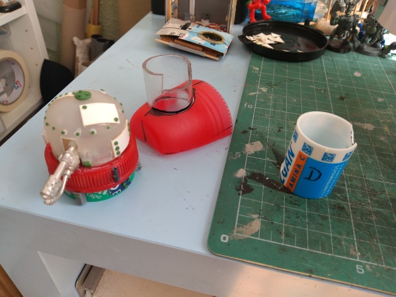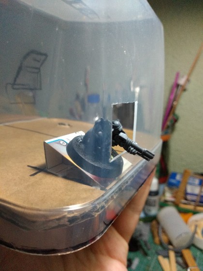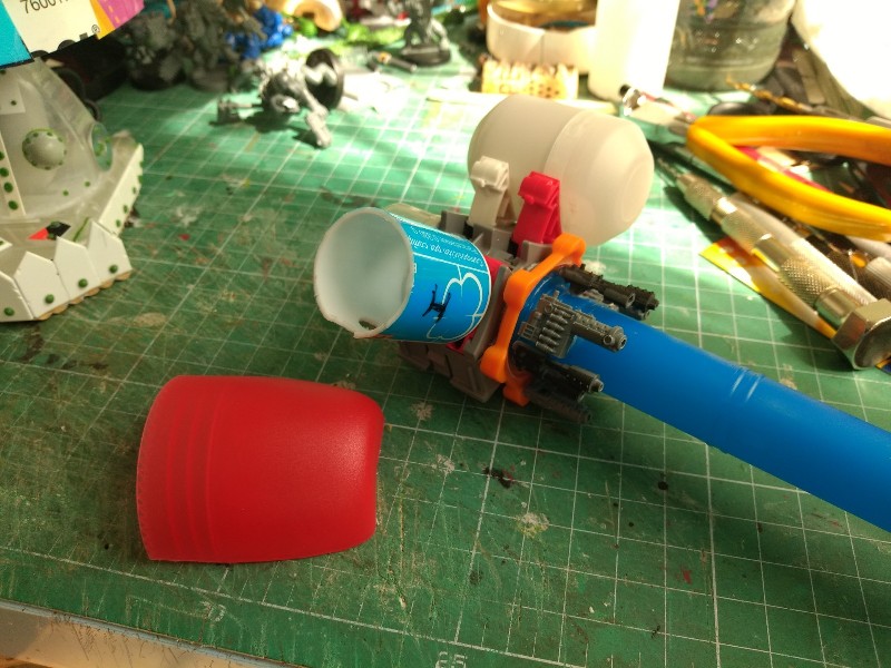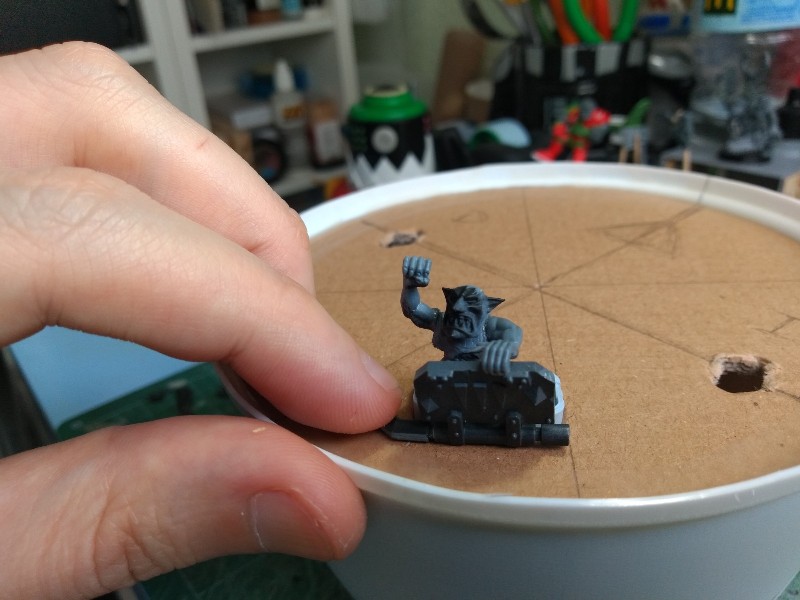 Pasamos al tercero en discordia, el Gargante del Mekániko; solo teníamos la cabeza terminada, los pies empezados, y pocas cosas más, así que nos ponemos a trabajar en el cuerpo. Como "viñeta" vamos a incluir a un gretchin asomado a una escotilla, disparando hacia abajo. Así que abrimos el pertinente agujero con la cuchilla en el tupper que usaremos como parte baja del cuerpo, y nos inventamos un sistema para que la figura quede como queremos.