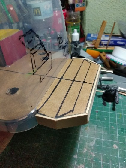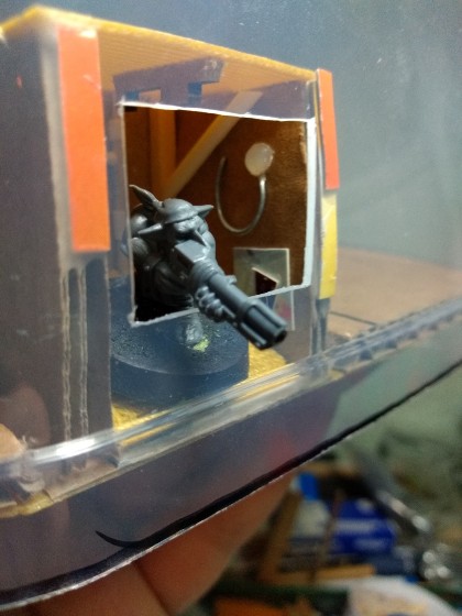 Nota: Recordad que yo hago mis piezas de escenografía/vehículos pensando siempre en las figuras, y tengo en cuenta sus peanas. El Gretchin será una de mis figuras normales, que se tiene que poder usar con normalidad en una partida, así que el hueco de la escotilla tiene el tamaño justo para que entre la peana y la figura, y la rampa inclinada nos permitirá conseguir el efecto de "disparo hacia abajo": (316)