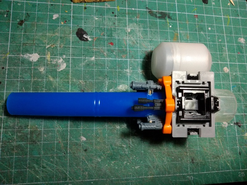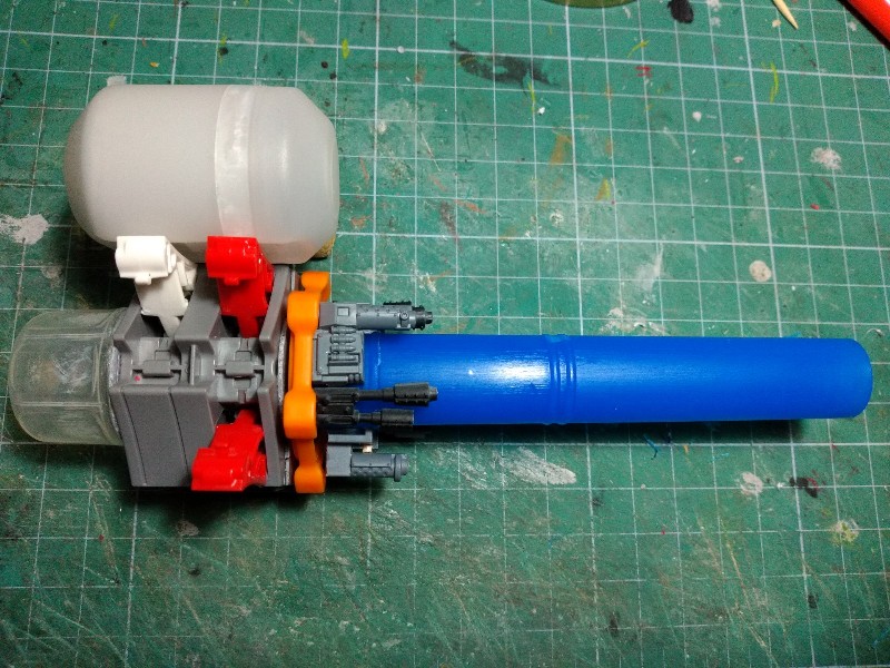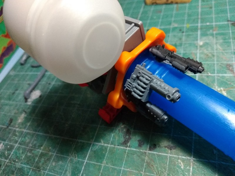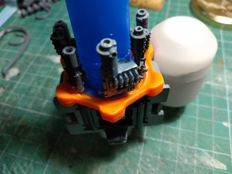 Solo tenemos el armamento del brazo izquierdo, así que le añadimos una sección de tubo de plástico a modo de acople con el hombro (no me gusta nada el efecto que tiene el arma principal puesta en línea con el hombro en el Stompa Oficial de Games Workshop): (305)