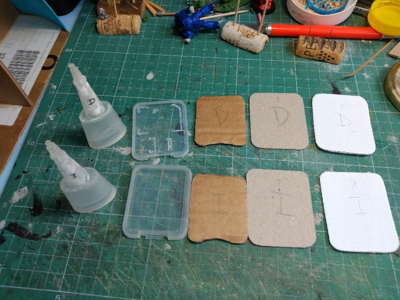 Primero seleccionamos piezas acorde: un par de botes gastados de SuperGlue de los de cánula larga (si algún empleado de LocTite está viendo ésto, debe de estar flipando de lo lindo con el uso que hago de su pegamento y luego de los envases de su producto). Para el pie en sí usamos un estuchito de plástico de una tarjeta de memoria para móvil, y para las suelas medimos y cortamos hasta tres capas distintas de cartón corrugado, cartón grueso gris y papel corrugado fino de paquete de galletas chiquilín: (277)