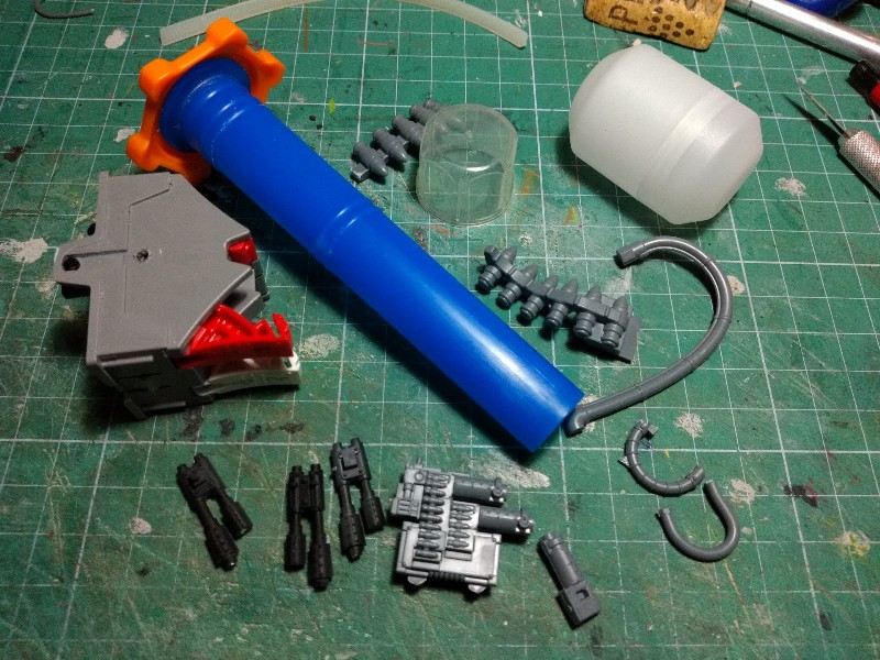 Reunimos piezas para el cañón del brazo izquierdo; una pieza de un conmutador eléctrico, un kinder, cables, cañones de armas orkas: (262)