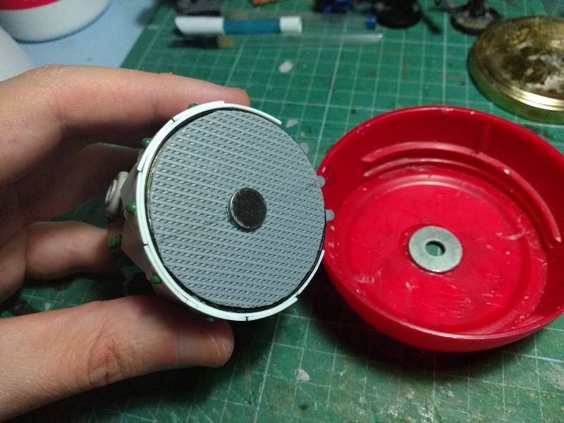 Mientras se seca, nos ponemos con la cabeza. En su momento pusimos una placa de rejilla en la parte inferior, así que pegamos un imán de neodimio y hacemos un taladro con arandela en la tapa de café (mismo sistema que en la torreta hecha anteriormente): (273)