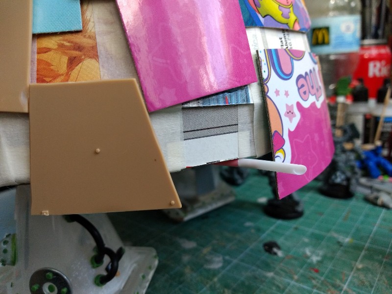 Como he encontrado un tubo abierto de silicona blanca en la estantería de las herramientas, antes de que se seque del todo vamos a aprovechar para hacer una prueba de blindaje del tipo "moderno" (muchas placas superpuestas y de diverso origen). Ponemos un pegote de silicona, colocamos encima el panel y presionamos. Y así sucesivamente, jugando al "Tetris" con los paneles para que quede un patrón lo más anárquico y orkoide que se pueda. Espero que sepáis valorar como se merece el efecto hipnótico de los fantasmitas por el blindaje de este Stompa: (285)