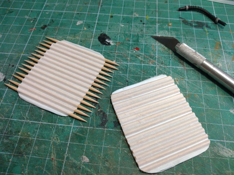 Sigo pensando que el secreto para que este tipo de vehículos quede bien chulo, es conseguir un verdadero efecto "3D". Y para ello le voy a dedicar todo el tiempo necesario. Por ejemplo, en una de las placas de blindaje más grandes hechas con cartón le vamos pegando con cola blanca cuadraditos de cartón fino, a modo de ajedrezado: (302)