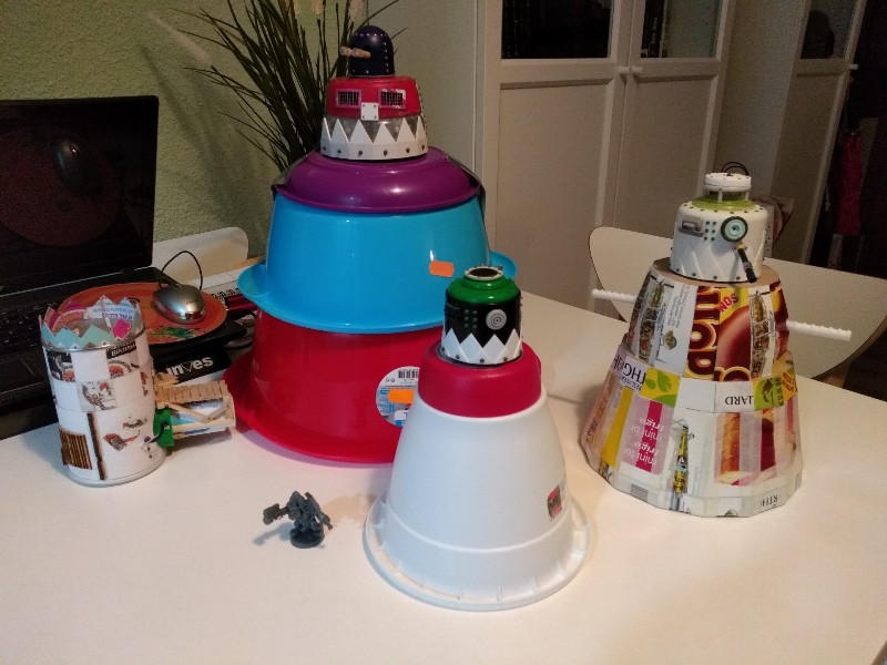 Con ellos hacemos unas cuantas pruebas y ésto es lo que conseguimos de momento: El Gargante, el Supa Stompa, y el Pizoteador con el que empezó todo (faltaría un cuerpo para la cabeza de Gargante del Mekániko que ya tenemos hecha). En general los tamaños son conformes con lo que tenía en mente, aunque obviamente hay muchas cosas que corregir (recortar los bordes doblados, sobre todo).