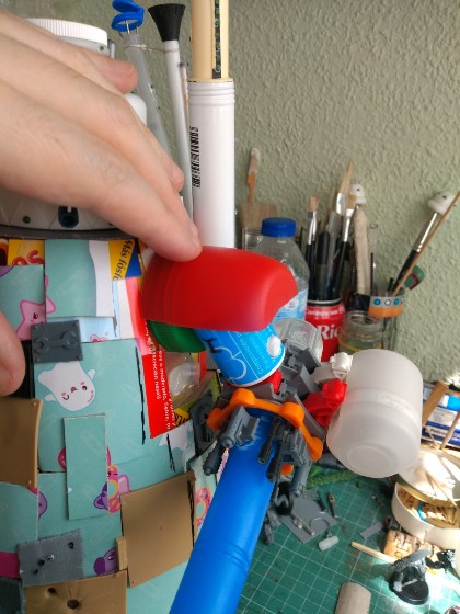 Para las hombreras estábamos usando un tapón de desodorante cortado por la mitad; una de ellas llevará encima la torreta que hicimos casi al principio de todo ésto, así que nos inventamos un sistema de anclaje/giro para dicha torreta: (304)
