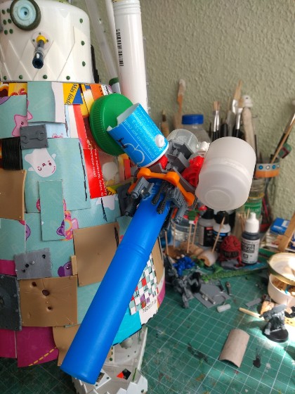La altura que habíamos previsto para lo brazos no me acababa de convencer, ¡pero no pasa nada!. Hacemos un nuevo agujero un poco más abajo en la articulación del hombro (que algunos llamáis tapón de botella de refresco) y ya está, el brazo quedará en la altura correcta: (306)
