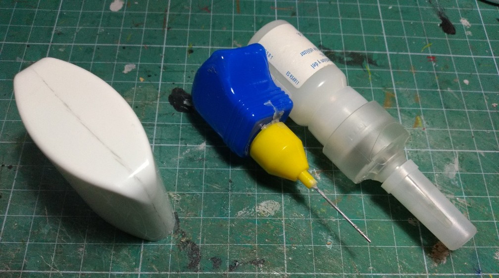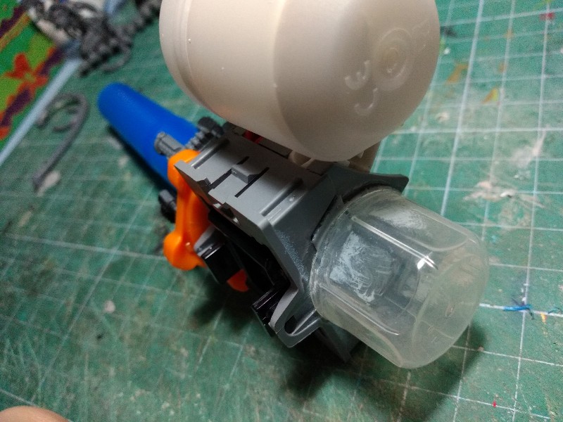 Con un tapón de desodorante haremos las hombreras, y con un bote de pegamento vacío y un nebulizador haremos el arma principal del brazo izquierdo: (276)