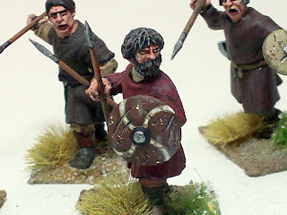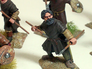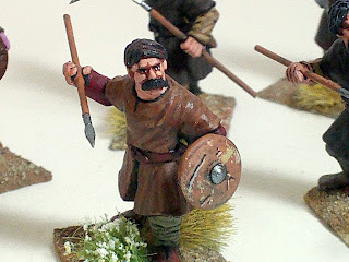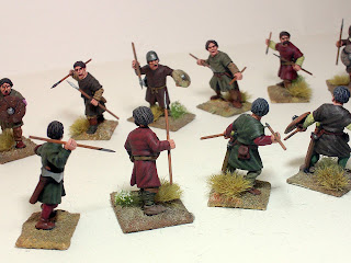 Mi amigo tiene intención de utilizarlos para un ejército castellano del siglo XI, más o menos, época del Cid. Pero como los ropajes y el equipo no son muy particulares, yo creo que se podría utilizar para varios ejércitos de la península ibérica de los siglos IX al XIII. Tengamos en cuenta que son solo peones, en ese nivel social los cambios en la moda no eran tan significativos (no se lo podían permitir). Y tampoco los vería muy fuera de lugar en el XIV. Excepto el del casco, ese tipo de yelmo es claramente alto medieval, por llamarle de alguna manera.
