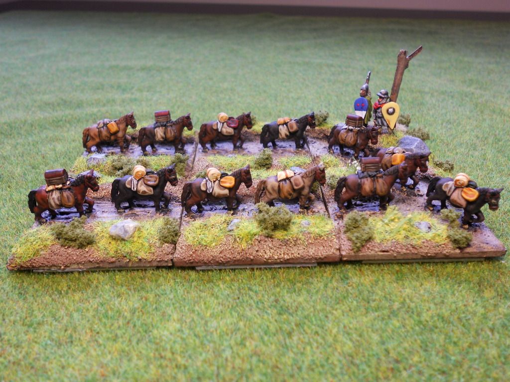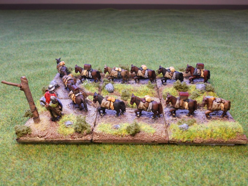 Hoy le toca el turno al bagaje del ejército castellano, desde el principio tuve claro que iban a ser unas acémilas que transportaran la impedimenta de la hueste. En esta época lo normal en la Península Ibérica era utilizar mulas como medio de transportar las vituallas y mantenimientos, denominados talegas, ya que los caminos solían ser impracticables para los carros.