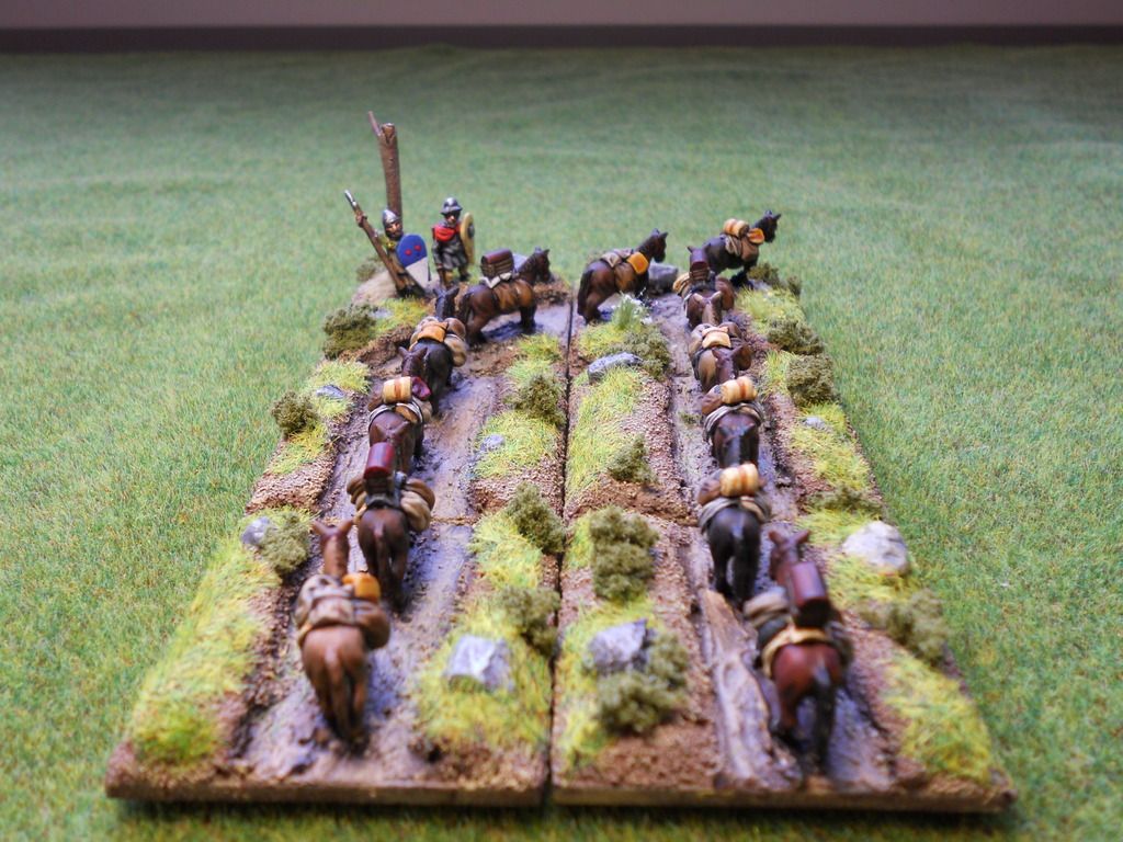 En vez de colocar un par de mulas por base sin más, se me ocurrió la idea de hacer dos caminos y que se encontraran en una bifurcación. Me hubiese gustado haber puesto algunos jinetes e infantes marchando a lo largo de los caminos, pero aquí me encontré con el problema del tamaño de las mulas. Y es que las mulas de Essex están bastante bien, pero tienen el grave problema de que son muyyy pequeñas, casi como un caballo de 10 mm, así que quedaba fatal poner otros caballos o infantes a su lado, una pena  :( .