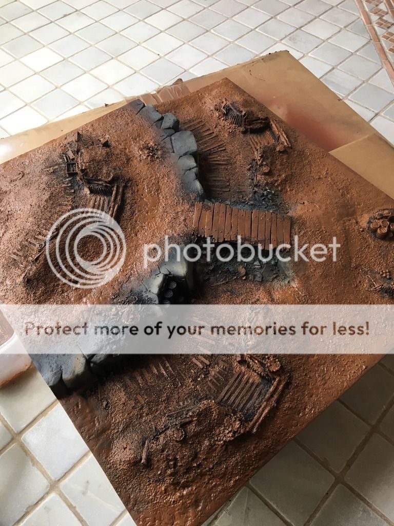 Bueno al caso, lo limpié, imprimé y posteriormente pintado con brocha para que luego agarrase mejor la pintura a aerografo. El siguiente paso será o bien un lavado, o bien diferentes pasadas de pincel seco. Luego pintado de toooodos los detalles, que son muchos, gabiones, tablones, rocas, arbol etc etc, sombrearlos, iluminar etc y por ultimo cesped y pigmentos. Si alguien tiene sugerencias en cuanto a colores y pintura, le escucho jaja que estoy algo perdido. Uso como referencias libros de osprey y guias de dioramas sobre siglo XVII-XIX, mi  objetivo es usarlo para mis ejercitos de finales del siglo XVII, también guerra 30 años y warhammer.