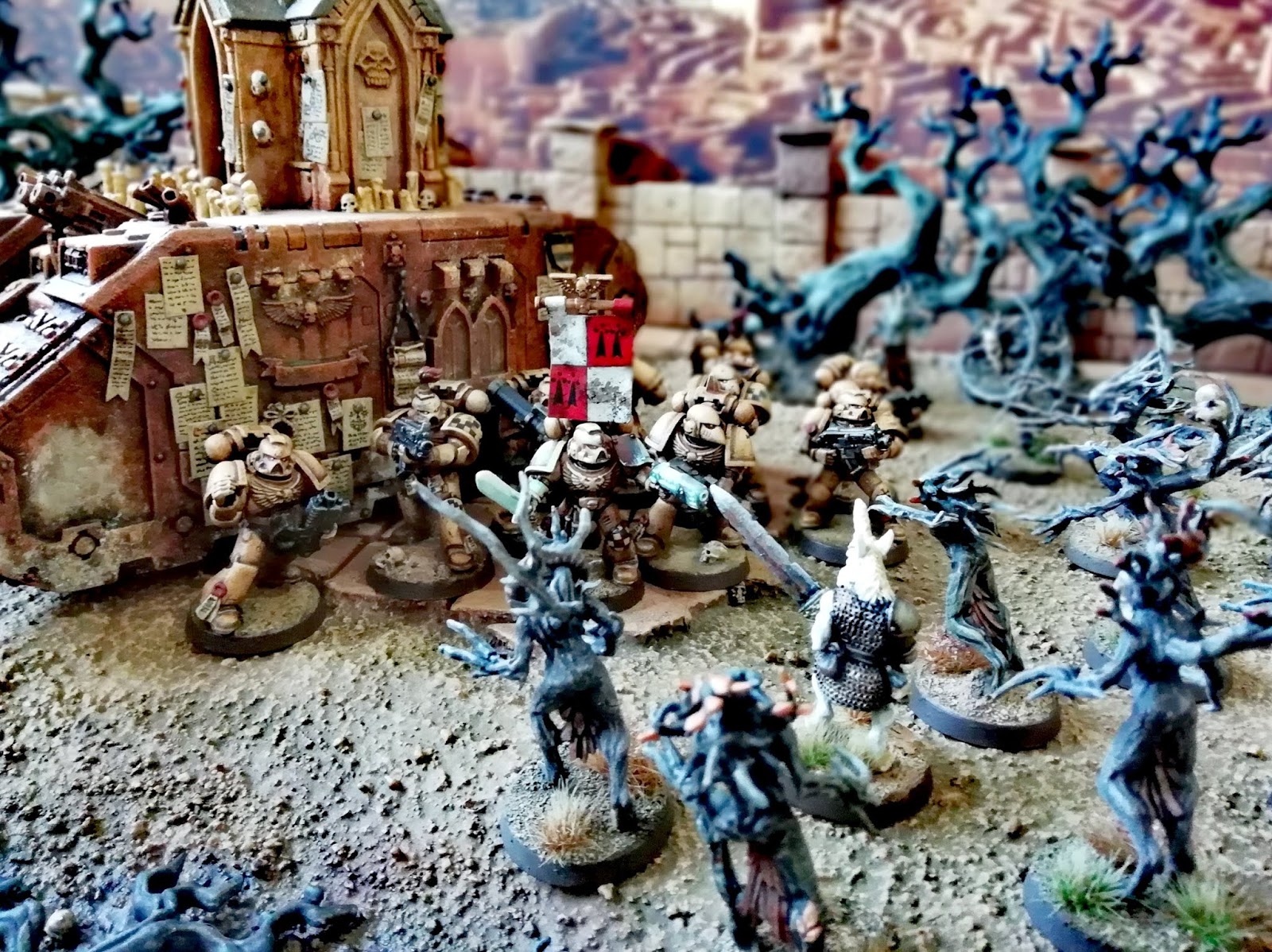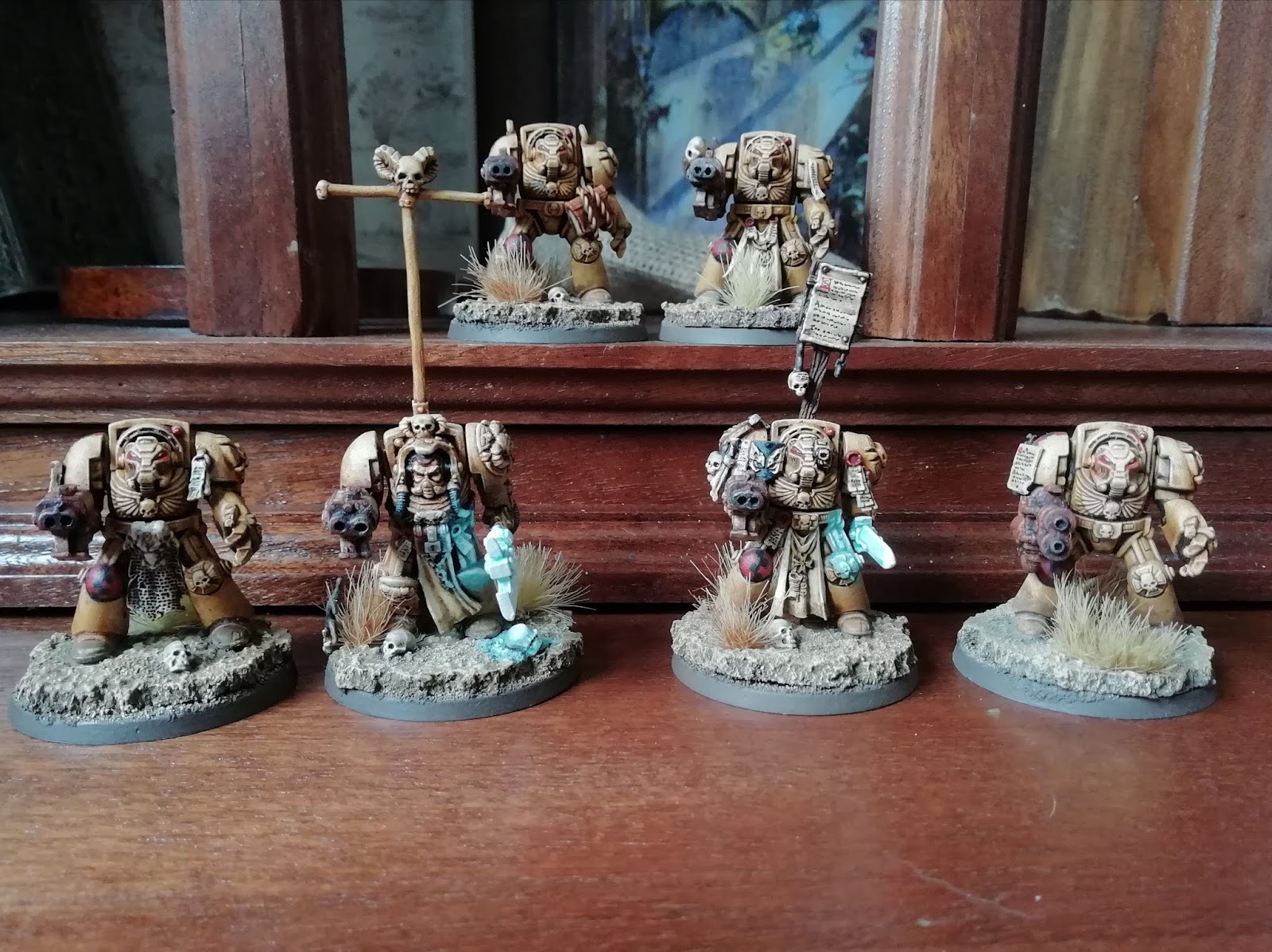 Esta es una de mis unidades favoritas entre mis Marines: la escuadra del "Capellán cabreáo y sus Cabronesmarines", como le decimos en mi grupo de juego. Es una unidad  que meto obligada en partidas grandes, y que ya ha ganado renombre por méritos propios.