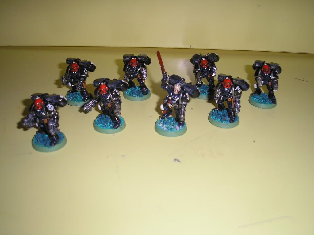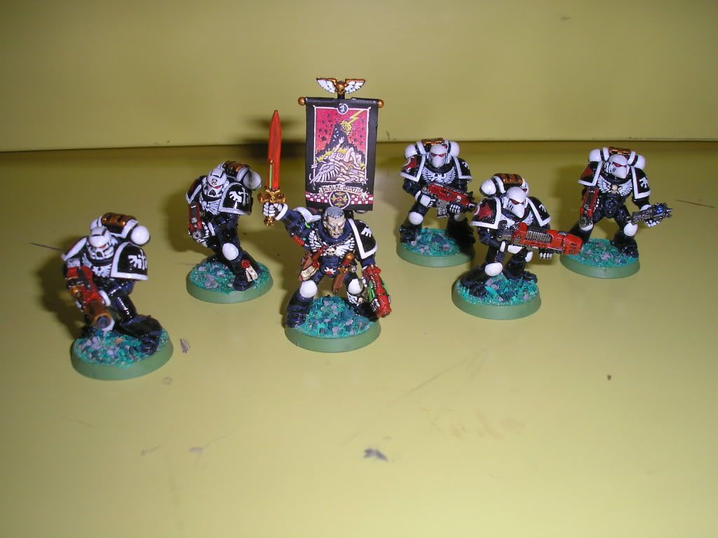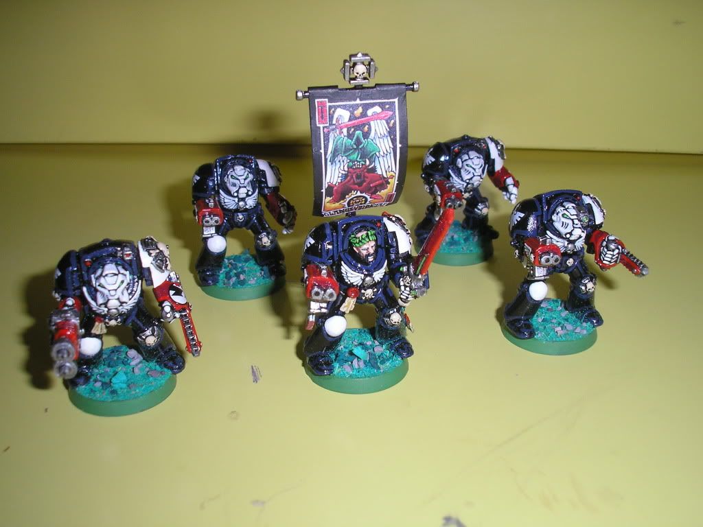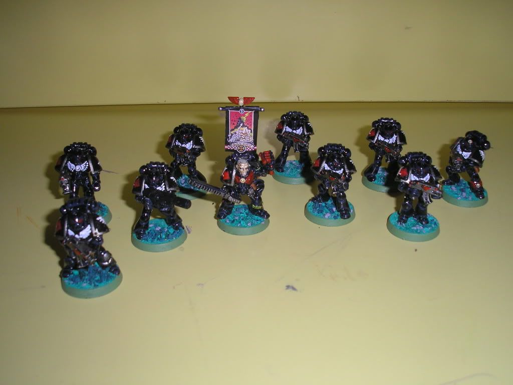 Se trata de un Capítulo de la Segunda Creación, los Angeles de Venganza. Está basado en el color original de los Angeles Oscuros, cuando la armadura era negra... (si encuentro el primer libro -un folleto en realidad- sobre cómo pintar marines espaciales, donde aparecían los primeros capítulos, le saco una foto y la subo... al menos los han mantenido en la última versión de codex)