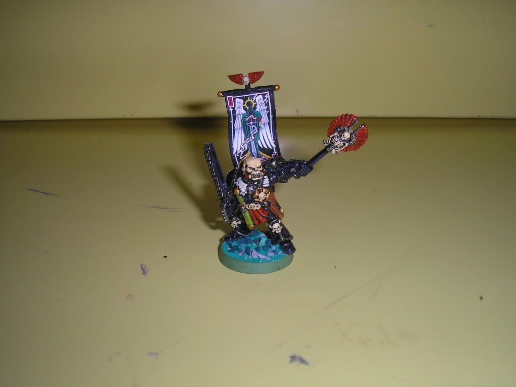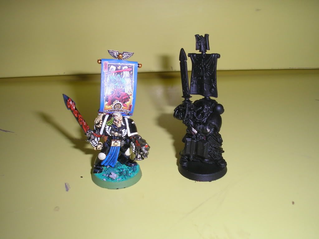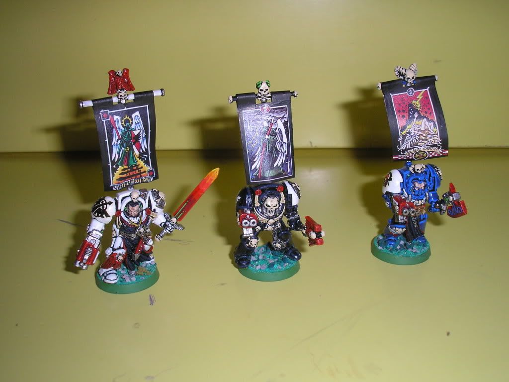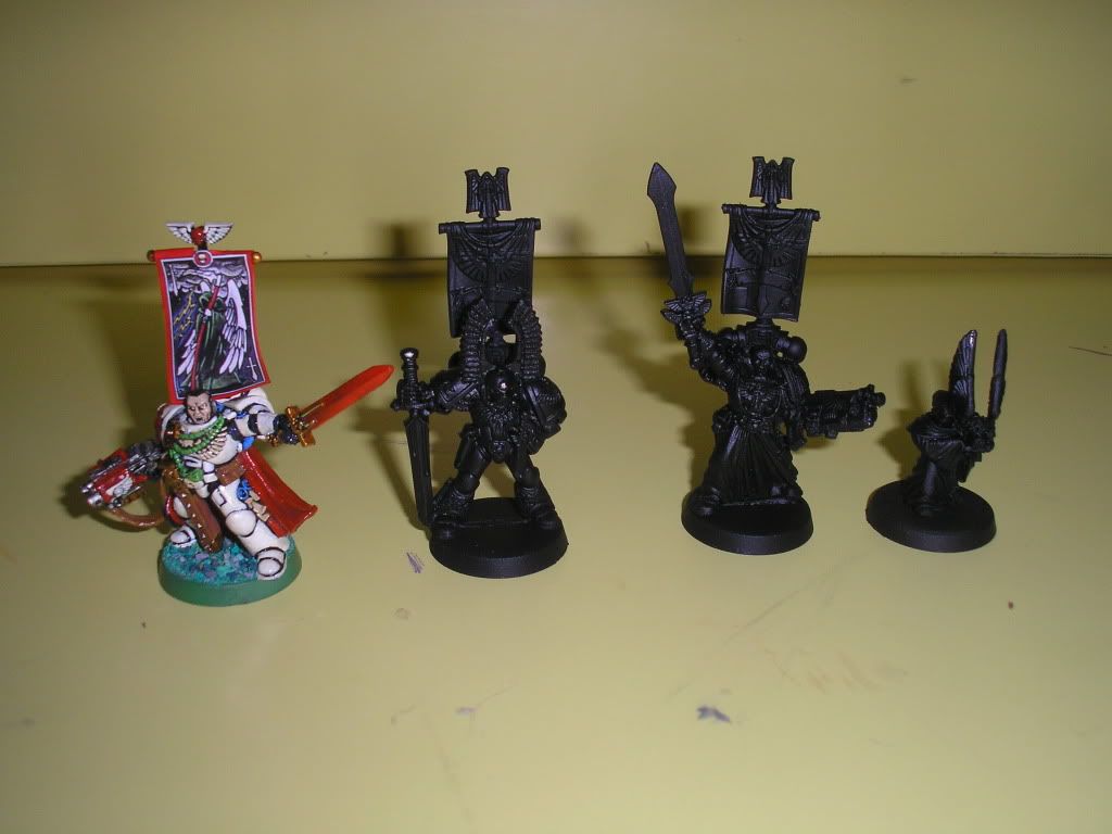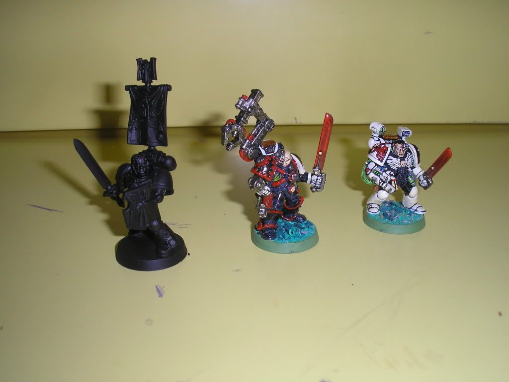 Capitán (Belial, los capitanes de los AOs no pueden llevar armadura de exterminador. Curioso, ¿no?), Capellán y Bibliotecario. Comparadas con las minis actuales, resultan un tanto pequeñas, pero mantienen el encanto de lo antiguo.