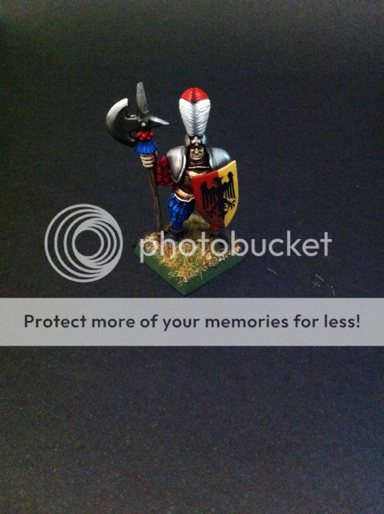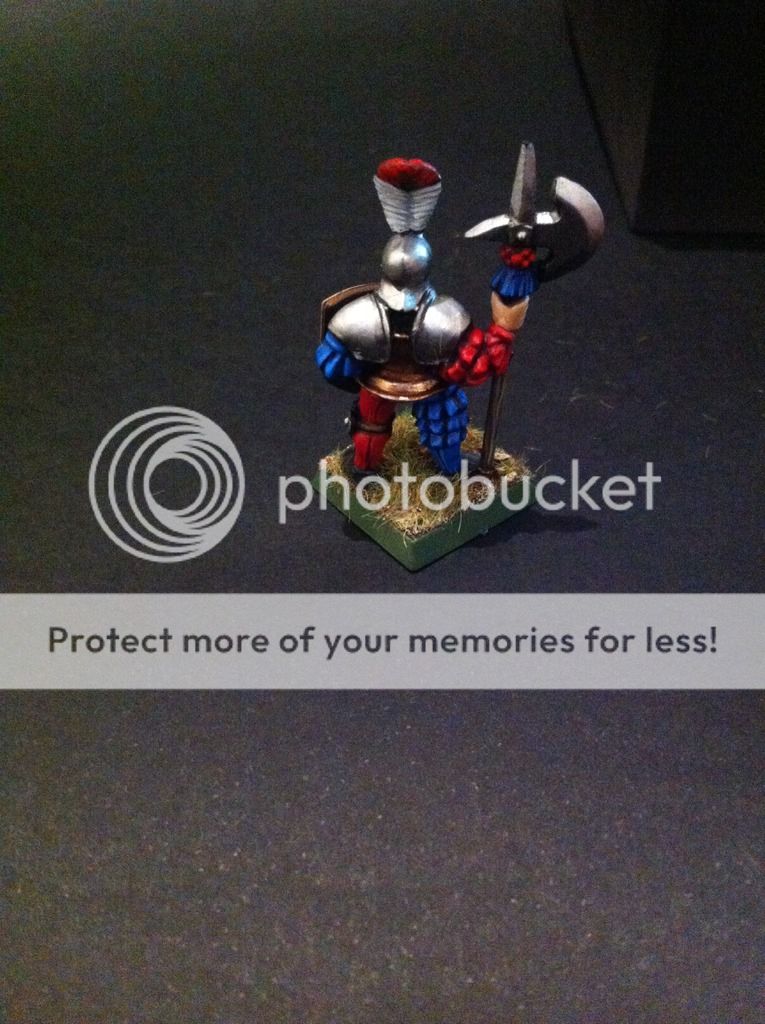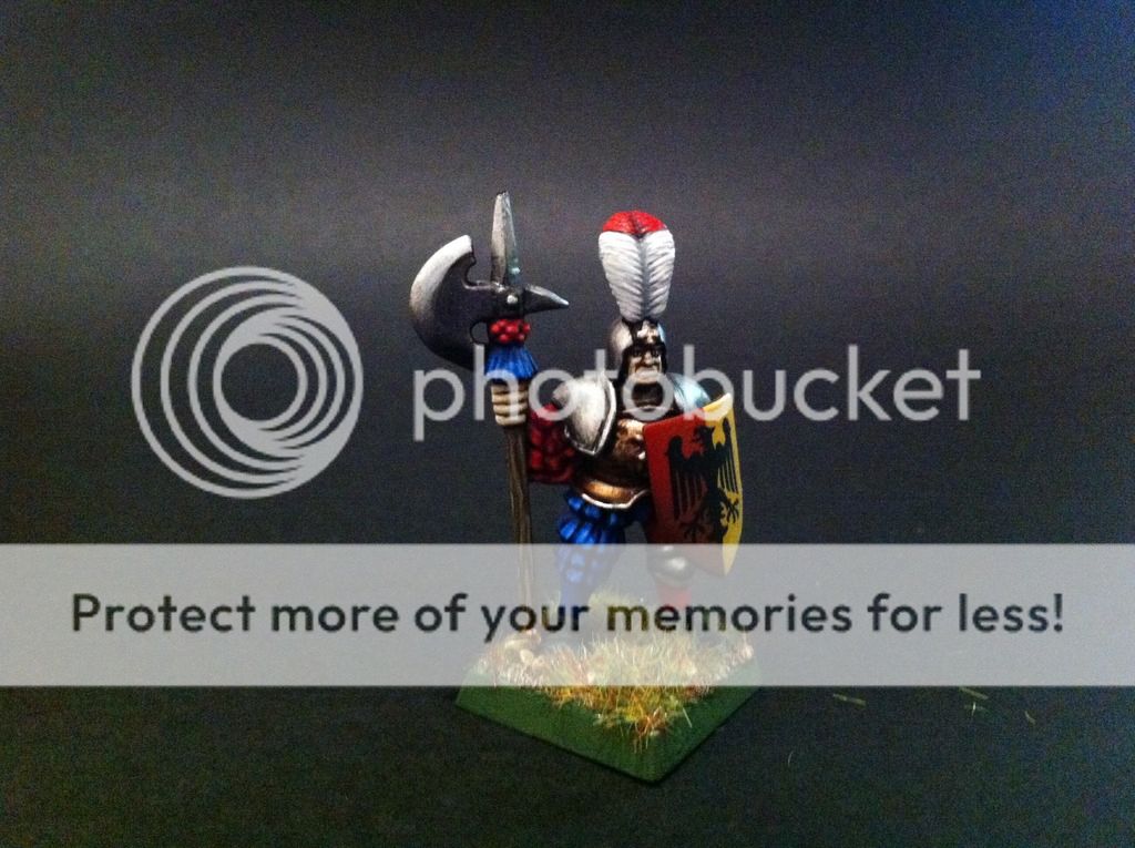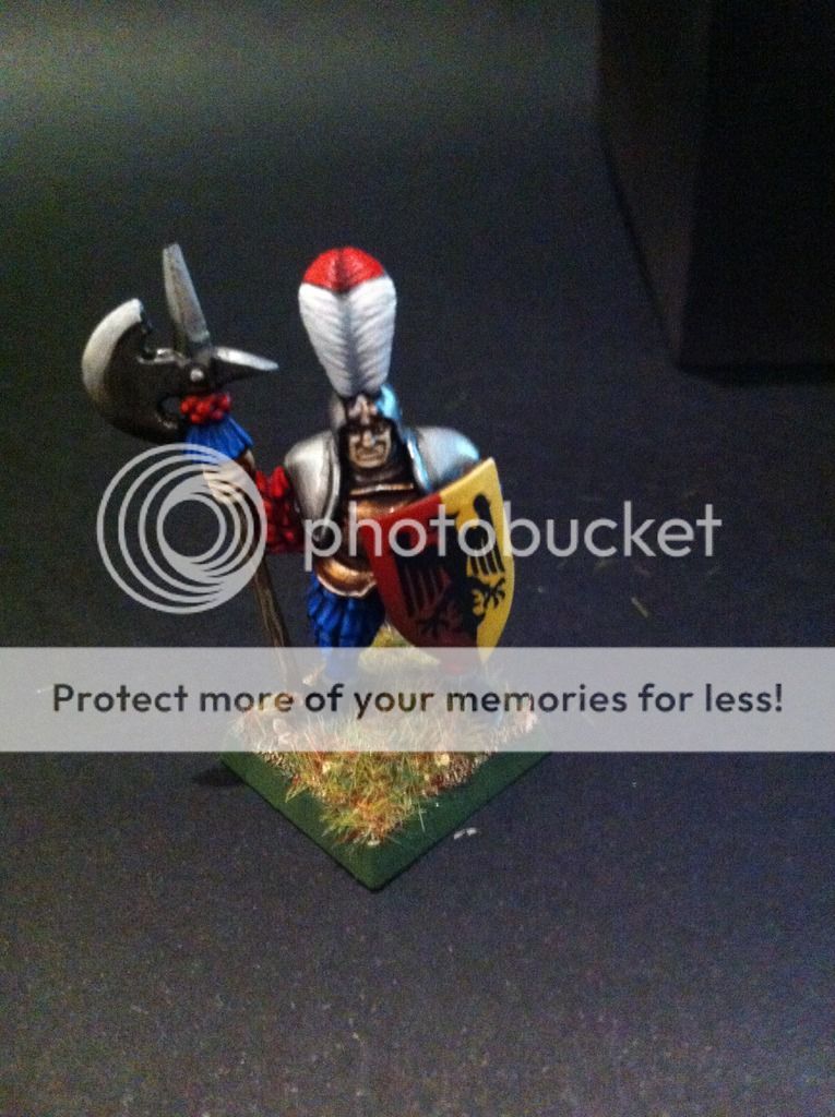 Ahora una figura de prueba de pintado de los alabarderos. El primero que pinto, de estos clones de principios de los noventa. La verdad es que para ser una figura algo tosca y haberla despintado ( parecia un muñeco de nieve maquillado con la escopeta de maquillaje de homer simpson), estoy bastante satisfecho... veremos a ver si mantengo mi entusiasmo tras pintar un regimiento de veinte de estos tipos.