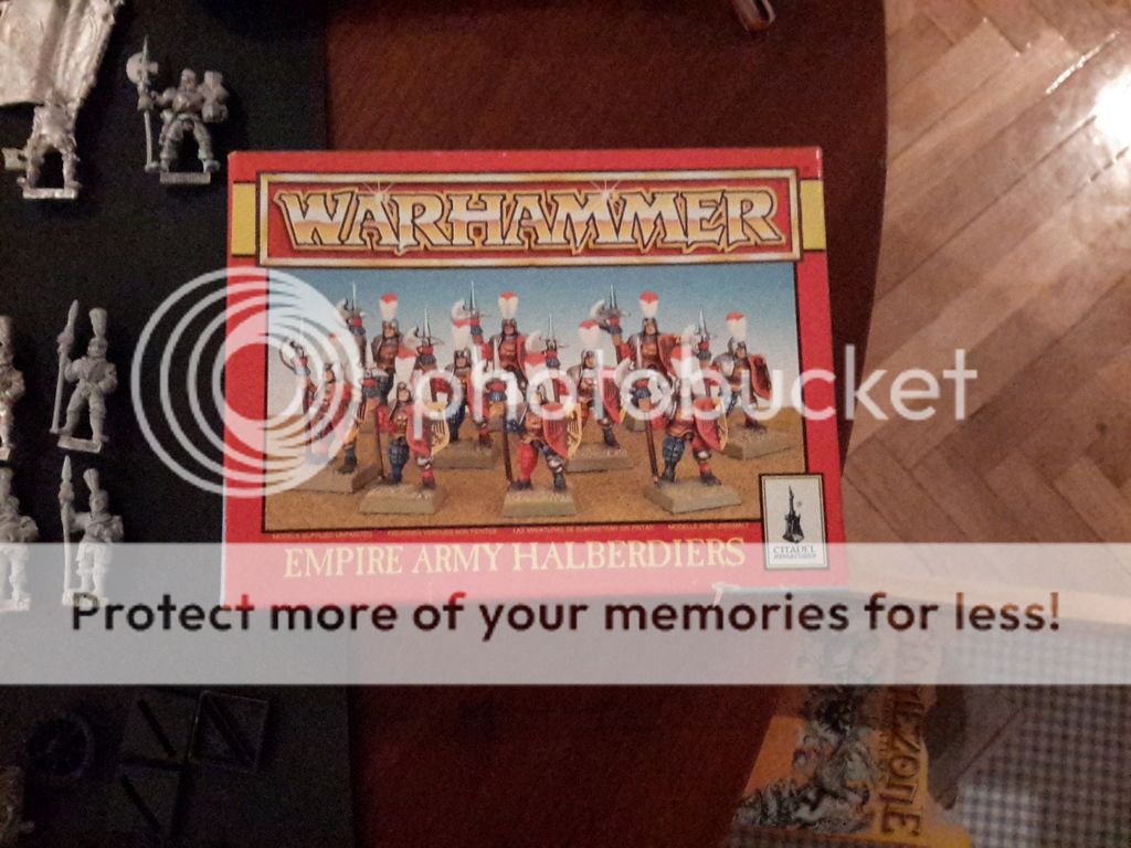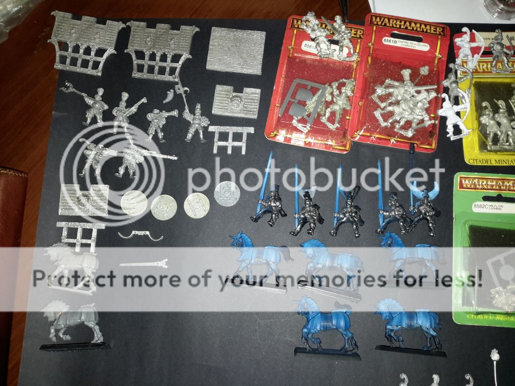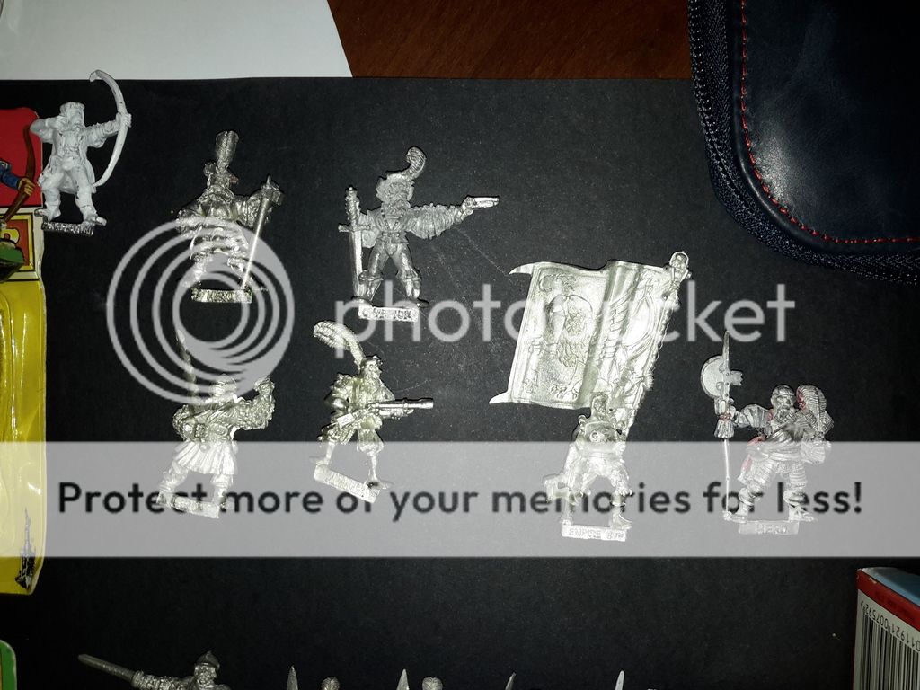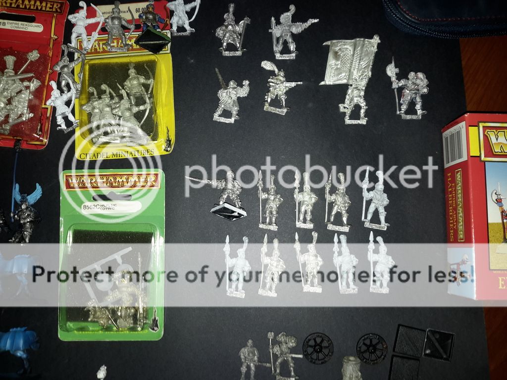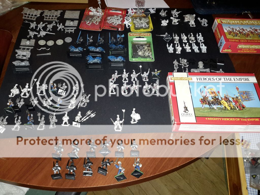 Una unidad de 5 caballeros pantera, 20 alabarderos clasicos de metal, 10 arcabuceros , mortero de metal, artilleros varios en metal, todos los capitanes imperiales del catálogo salvo uno,  una unidad de espadachines,  7 caballeros a pie de la Reiksguard ( necesito 3 mas) y unos Halflings, que también necesito mas...  un carro de guerra y heroes a caballo, ahí van las fotos!!