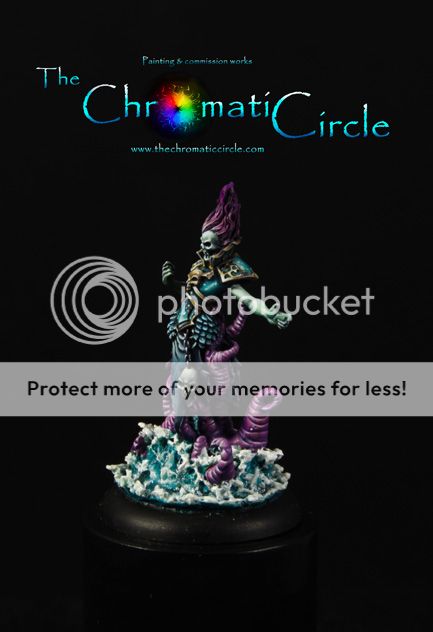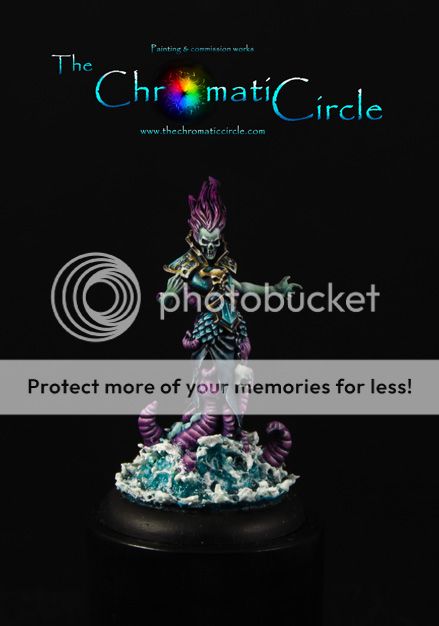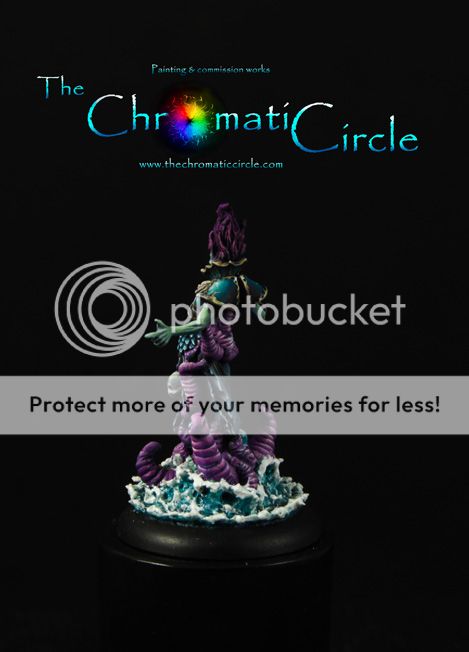 Os traigo a Zadmul, de Tale Of War. Figura que supuestamente es un nigromante, pero que a mí me parecía, primero, una mujer (si, sin tetas, ok) y segundo, relacionada con el mar. Por lo que me parecía más bien una bruja del mar o algo así, así que le hice unas olas y tal a la base, que no las había hecho nunca y me apetecía probar, y la pinté en colores rarunos que no suelo usar, por probar algo.