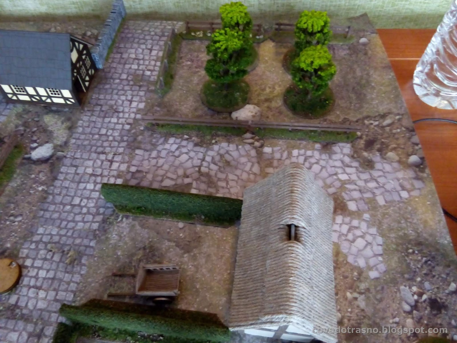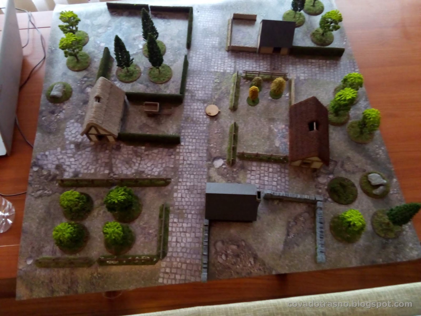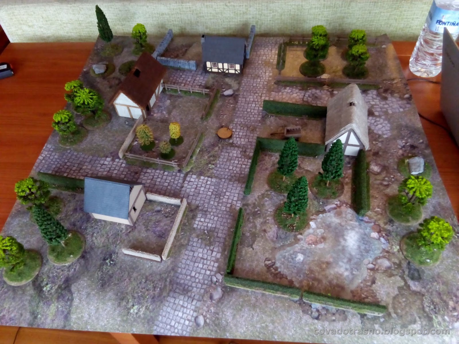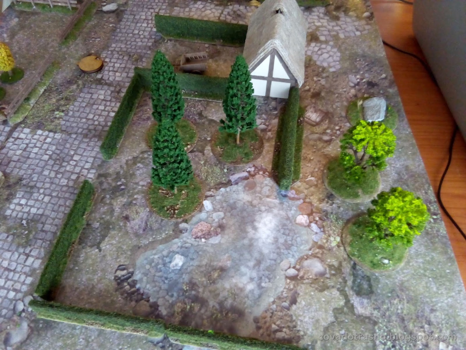 A ver, depende de tus espectativas. A mi me gusta el juego, y cuanto más escenografía, mejor. Esa mesa la monté en 5 minutos. Una partida puede durar entre una hora y dos, dependiendo del escenario y la experiencia de los jugadores. Las figuras, casi todo el mundo tiene en casa figuras que valgan. Te vale un arquero o un ballestero medieval, un ranger de LOTR, un bárbaro, etc. Yo incluso uso figuras  de enanos. Y si no tienes gnolls que hacen falta en algunos escenarios, pues orcos y punto. Luego lo que te quieras implicar es cosa tuya.