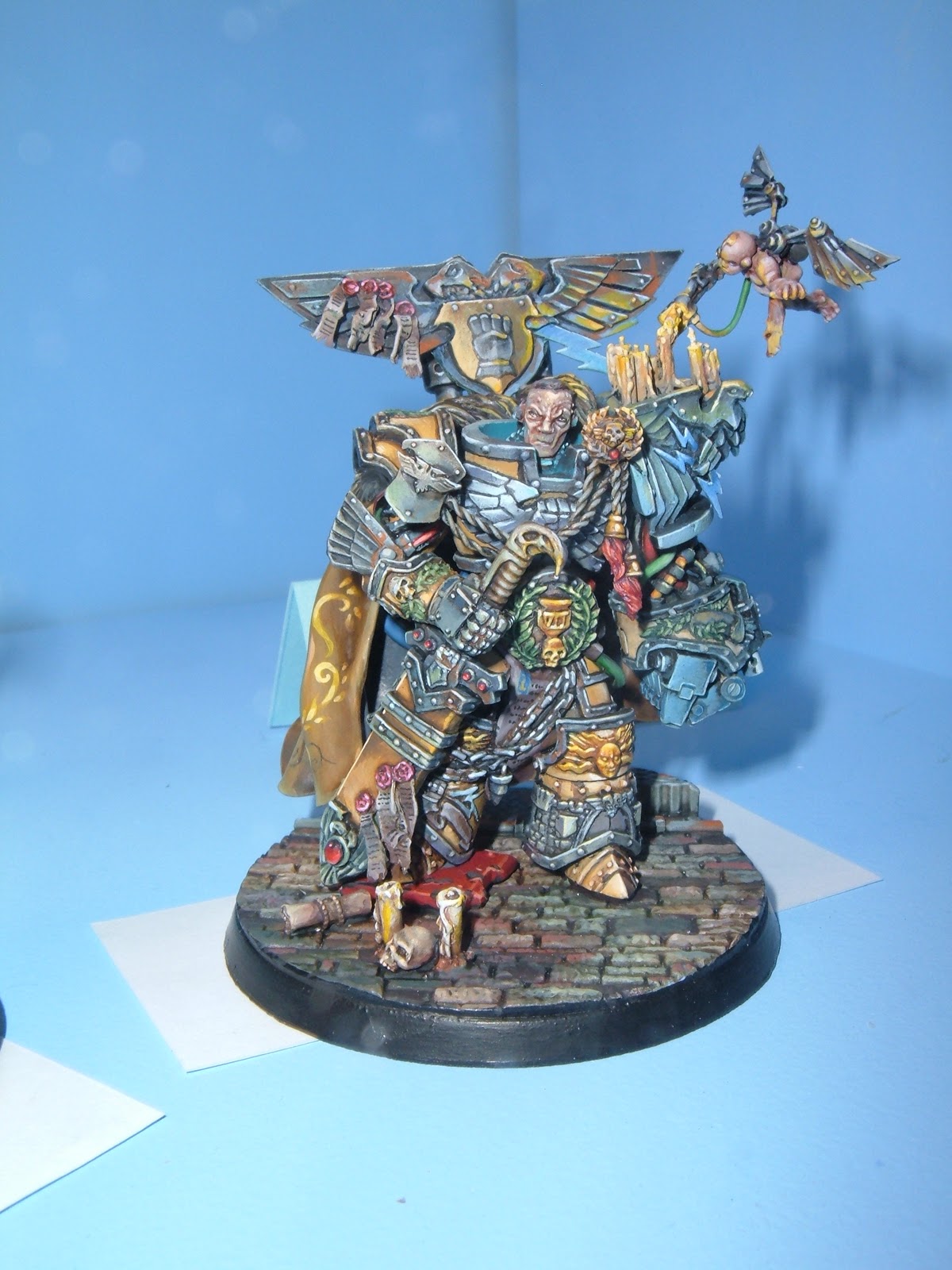 El nivel de pintado es impresionante, pero por que las manos en azul-negro?¿ Vale que quisiera reprensentar el puño negro de la iconografia en Dorn, pero no hagas eso, el puño de combate va a ser un punto focal importantisimo, destacalo pintandolo en amarillo, no en negro-azul!