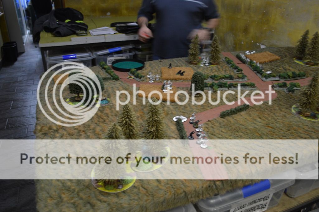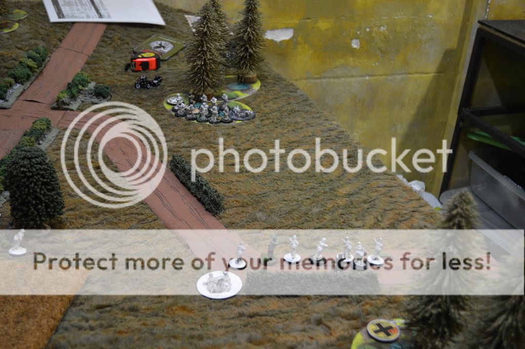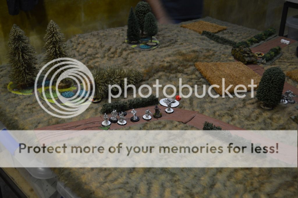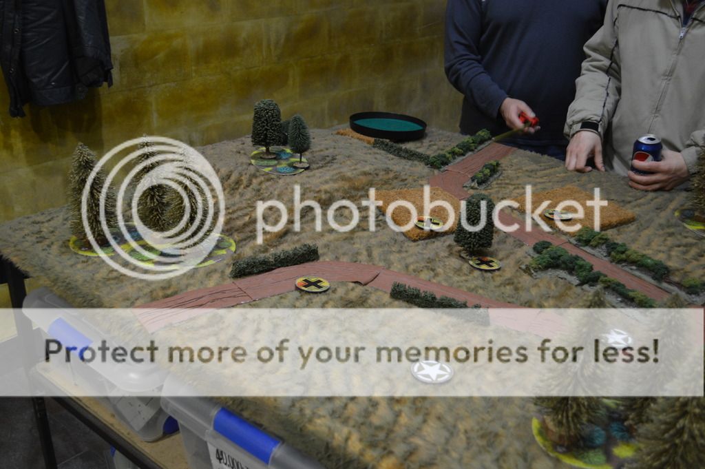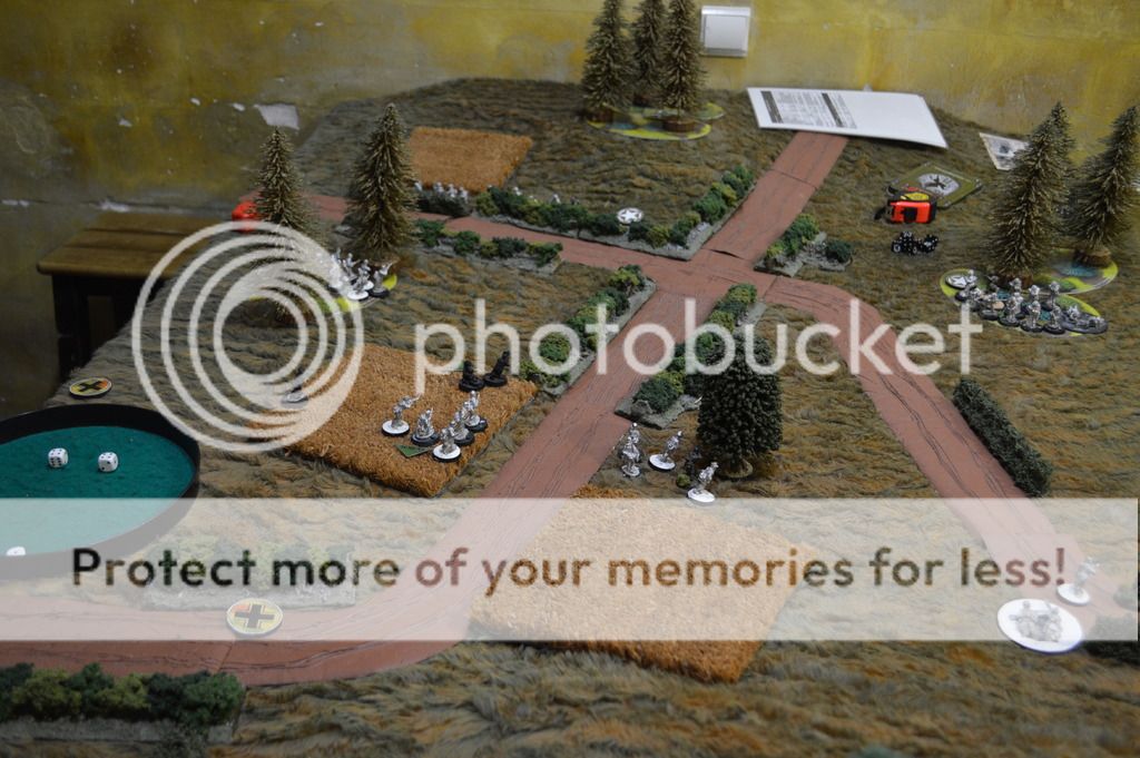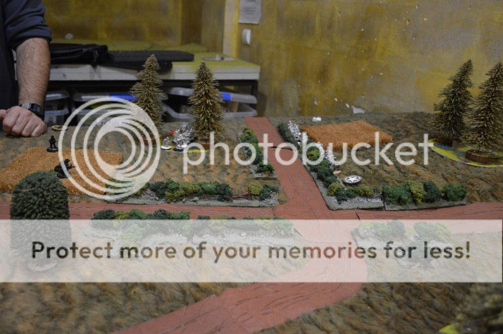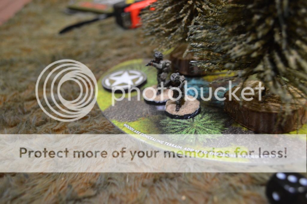 En un primer momento debido al bombardeo mis tropas no pudieron desplegarse correctamente mientras que los alemanes avanzaban terreno pudiendo eliminar uno de mis puntos de despliegue. Una vez que los americanos sale se sitúan dos escuadras en el bocage defendiendo el objetivo junto con un mortero en la colina y otra escuadra con un equipo de bazooka en el bosque defendiendo el flanco izquierdo.