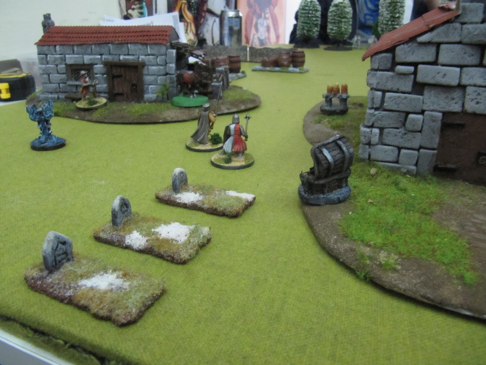 Decidimos usar unos vikingos de Saga (yo) y unos templarios de Fireforge (Carlos). Las bandas las creamos sin puntos, simplemente establecimos un límite de 10 niveles por banda. Mientras íbamos montando la mesa, fui pensando el escenario. En este caso, una avanzadilla de incursores norteños que irrumpen desde el bosque para saquear una pequeña aldea. Sin embargo, se encontrarían con la dura oposición de los hombres de armas del Conde.