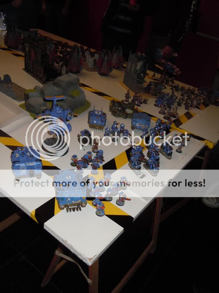 Ya en mi tercera partida y viendo los resultados, pensaba estar compitiendo por la cuchara de palo (que venía acompañada de una bonita foto de un marine enmarcada), pero me encontré en la mesa 13 luchado con Pedro Kantor y sus veteranos ¿ultramarines? ¡Era un ejercito de Puños Carmesíes pintados de Ultramarines! (¡Impugno!). Bueno, la lucha se llevó a cabo en mi zona de despliegue, y al final se perdió por la mínima... De hecho, maté más que mi rival, y tuve un par de errores de bulto (olvidar a unos exploratas escondidos en unas ruinas, por ejemplo). En esta hubo absurdos asaltos interminables... marines dándose manotazos como niñas de instituto durante horas...  :doh
