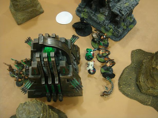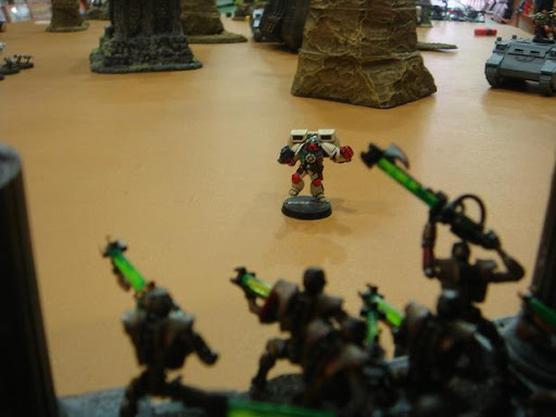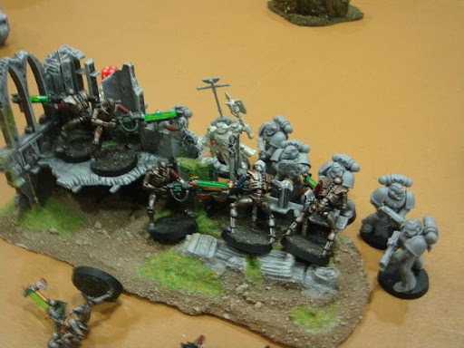 Esta imagen que viene fue divertida, antes de que me asaltara por las buenas me aleje para luego acercarme y lanzarle un fuego rapido molon. El problema esta en que de esos 20 disparos de armas gauss solo hirio 1 y obviamente salvo armadura...  Luego los necrones huyeron y fueron arrasados ¿Por qué huyen los necrones? es antitrasfondistico, ¿no?
