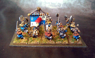 Unidad de 15 con grupo de mando. He tenido que hacer conversiones en casi todas las figuras de la unidad. Aunque creo que son las figuras que más me gustan de todos los enanos (la del hacha es mi favorita), las dos figuras son muy diferentes entre sí e iba a cantar mucho en la unidad.